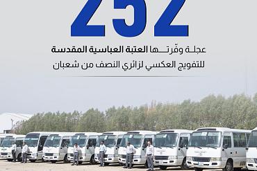 • شعب واعمال قسم الآليات : - شعبة المرآب مسؤولة عن إدامة ومتابعة العجلات التابعة للعتبة المقدسة ، تضم عدة وحدات منها : -( الاستعلامات) التي تنظم عمليّات دخول وخروج الآليات ، و (وحدة المخازن والأدوات الاحتياطية) تضم جميع أنواع المواد الاحتياطية الخاصة بالعجلات التابعة للقسم. -شعبة السيطرة : مسؤوليتها السيطرة على حركة آليات القسم ، تحديد نوع الآلية المناسبة لكل مهمّة ينظم عملها من خلال سجلات الحركة اليومية للآليات ، حيث تنظم هـذه الـسـجـلات وقـت خروج كل آليّة ووقت العودة ونوع العجلة ورقمهـا وأســـم السائق والجهة المستفيدة من الحركة المذكورة ، والعدد الذي يؤشره عدّاد قطع المسافة الخاص بها قبل وبعد الانطلاق. -الشعبة الإدارية والماليّة : متابعة (الأمور الإدارية حضور المنتسبين ، الأمور المالية ، وجميع الكتب الصادرة والواردة) للقسم. -شعبة نقل الزائرين : متخصصة بتهيئة وتوفير عجلات نقل الزائرين مجاناً من عدة محاور ، أي من مناطق القطع الى العتبة المقدسة وبالعكس.