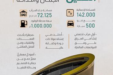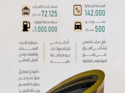 أُقيم المرآب على مساحة تبلغ (72.125) م2 وبمساحة بناء (142,000) م2، وقد قُسّم لخمسة مقاطع : 1- مخصّص للإدارة المركزيّة ويقوم بتدوين وأرشفة جميع المعلومات الفنّية لأيّ عجلةٍ تدخل المرآب . 2- محطّة لتزويد السيّارات بالوقود بنوعَيْه (البنزين – الكاز أويل)، إذ تبلغ السعة الإجماليّة الخاصّة بها (1.000.000) لتر وهذا القسم مزوّد بتقنياتٍ حديثة. 3- مجمّع خاص بصيانة العجلات الخفيفة. 4- مجموعة ورشٍ متكاملة لصيانة وإدامة العجلات الثقيلة. 5- موقفٌ للسيّارات بكلّ أنواعها سواءً العجات الكبيرة أو الصغيرة، حيث يتكوّن هذا الجزء من طابقَيْن كبيرَيْن روعي فيهما تقسيم الأماكن الخاصّة بخزن كلّ نوعٍ من السيّارات وبسعة نحو (500) سيارة تقريباً بجميع أنواعها.