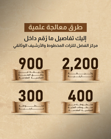 يضم المركز كفاءات علمية وفنية تعمل في مجال المحافظة على التراث المخطوط وكذلك صيانته والمحافظة عليه من التعفن والأضرار الناتجة من تقادم الأزمان والأضرار التي تلحق به نتيجة الظروف الجوية والتدخل البشري, وصناعة الورق الطبيعي وتحضير الرق الجلدي, بالإضافة لفن الزخرفة.