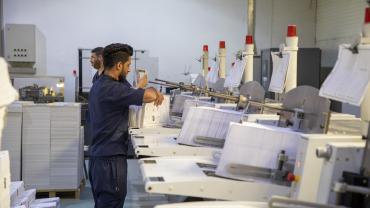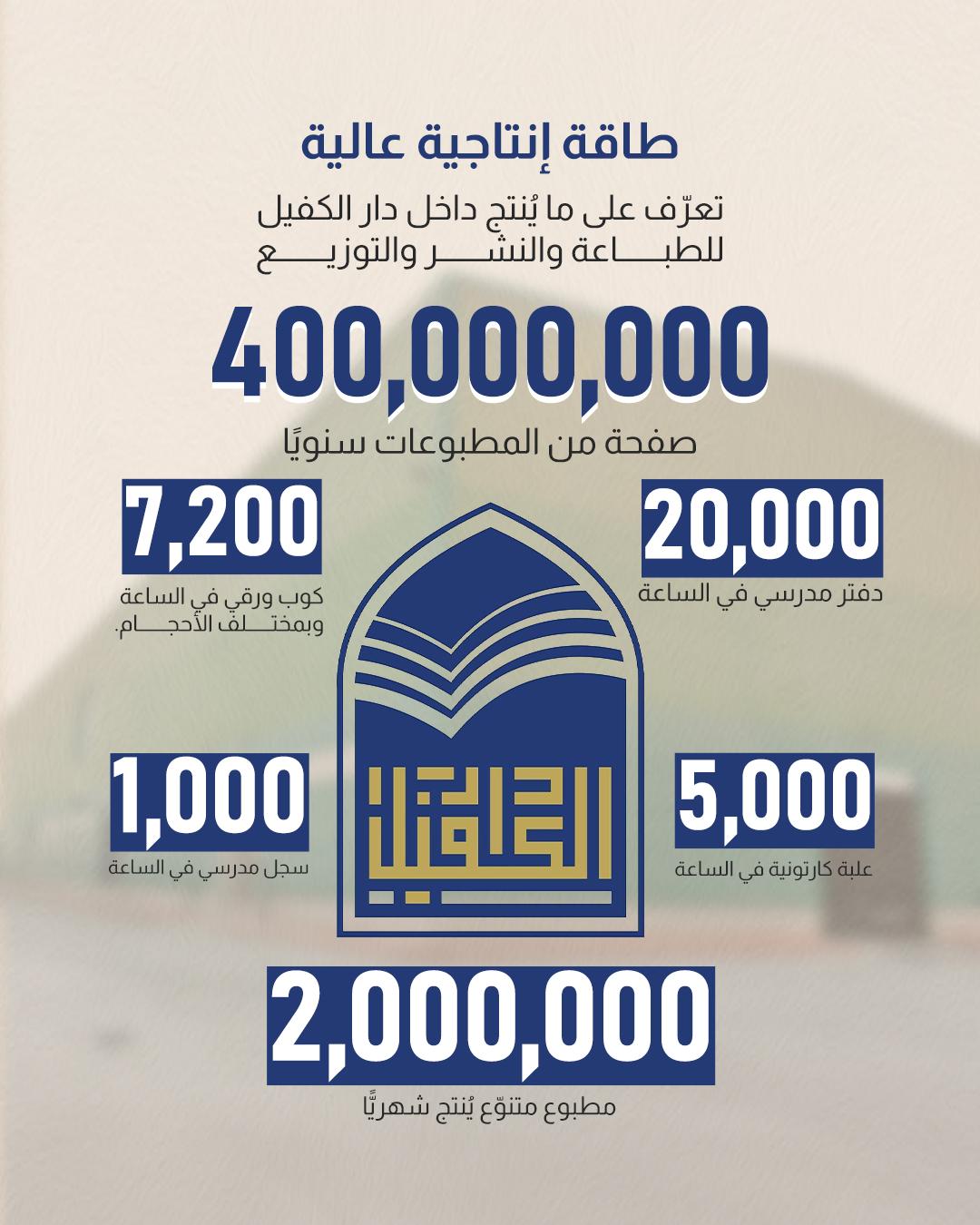 • المساحة وأهم مواصفات المشروع - تدار من قبل كادر عراقي تم زجه بدورات داخل وخارج العراق لأجل زيادة الخبرات والاطلاع على التقنيات الحديثة التي تم تصنيع هذه الأجهزة فيها. - حصولها على أربع وكالات لورق المكتب والأوفست.... ، وغيرها - الدار تعاقدت مع وزارة التربية العراقية ؛ لغرض طباعة المناهج الدراسية بجودة عالية وكلفة أقل رفداً منها للمسيرة التربوية في بلدنا - تمتلك التقنيات الحديثة والخبرات الكافية ، مما يؤهلها لإنجاز الكثير من الأعمال ، حيث منها افتتاح خط إنتاج الدفاتر المدرســيـة الذي يُعـد الـخـط الوحيد في العراق ، وتصل طاقته الإنتاجية الى ( 100,000) دفتر في اليوم.
