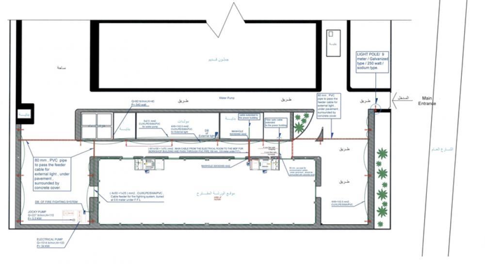 • المساحة وأهم مواصفات المشروع: مساحته ( 64,750) م 2 يقسم الى قسمين: - القسم الأوّل عبارة عن ورشة تتألف من طابقين تبلغ مساحة الطابق الواحد ( 3,000) م 2 - القسم الثاني عبارة عن مخزن يُقام على مساحة ( 2,500) م 2 - استُخدم في تصميمة وتنفيذه الفضاء المفتوح - زُوّد المشروع بأكمله بمنظومات للإطفاء والحريق والإنذار ومنظومة خاصة بكاميرات المراقبة وشبكة طرق داخـلـيـة وشـبـكـة لمياه المجاري والإسالة ومجاميع صحية وغرف خاصة بالإدارة وغيرها - شبكة طرق متكاملة تتناسب واستخدام هذه المجموعة.