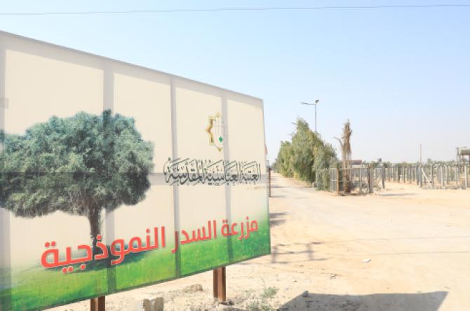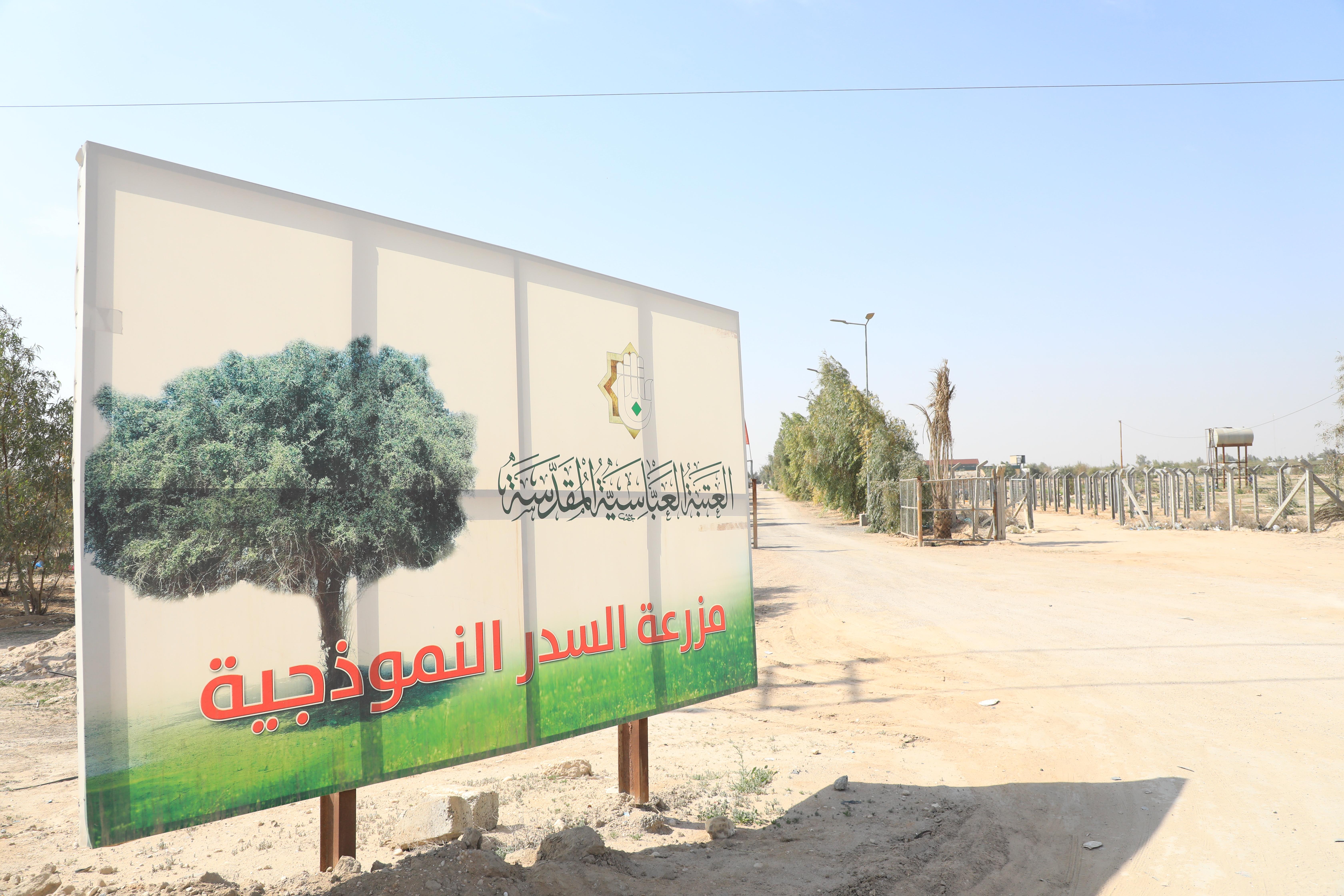 • المساحة وأهم مواصفات المشروع: مساحتها ( 70) دونما زرعت فيها ( 5,608) أشجار من السدر ، وزّعت على خمسة مقاطع توشم كل مقطع بأحد أسماء أصحاب الكساء ( عليهم السلام) وكما يلي: - القاطع الأوّل مزرعة خاتم الرسل-صلى الله عليه وآله مساحته ( 11) دونماً ، الصنف المزروع فيـه هـو السدر الموريتاني أو ما يُسقى التايلندي ( iziphus mauritiuna ، وهو غير معروف محلياً ، يمتاز بسرعة نموه وكبر أوراقه وقلّة أشواكه وتحمله أجواء وسط وجنوب العراق - القاطع الثاني مزرعة علي بن أبي طالب- عليه السلام) مساحته ( 8) دوانم ، والصنف المزروع فيه هو السدر الصيني ( Ziziphus jujube) وهو صنف منتشر محلّياً ومعروف ، ويتم إكثاره خضرياً بشكل واسع في العراق بواسطة التطعيم على أصول محلية ، ولديه عدة مميزات وتحمله أجواء العراق. القاطع الثالث ( مزرعة فاطمة الزهراء- عليها السلام مساحته ( 12) دونماً ، زُرعت بالسدر الموريتاني. - القاطع الرابع مزرعة الإمام الحسن- عليه السلام- مساحته ( 13) دونماً ، زرعت بالسدر الموريتاني - القاطع الخامس مزرعة الإمام الحسين- عليه السلام- مساحته ( 12) دونماً ، زرعت بالسدر الموريتاني. - أحيطــت الـمـزرعــة بأحـزمــة صـد خضرية حزام داخلي وخارجي ، يتكوّن من خط سدر ( محلي) وخط من أشجار الزيتون بواقع ( 230) شجرة ، وآخر خط ( يوكالبتوز) لكل مقطع من المقاطع الخمس ، بالإضافة الى خط ( يوكالبتوز) يحيط بالمزرعة ككل وبواقع ( 2,000) شجرة ، مع زراعة خط شوك الشام في الجهة الأمامية للمزرعة بلغ عددها ( 50) شجرة.