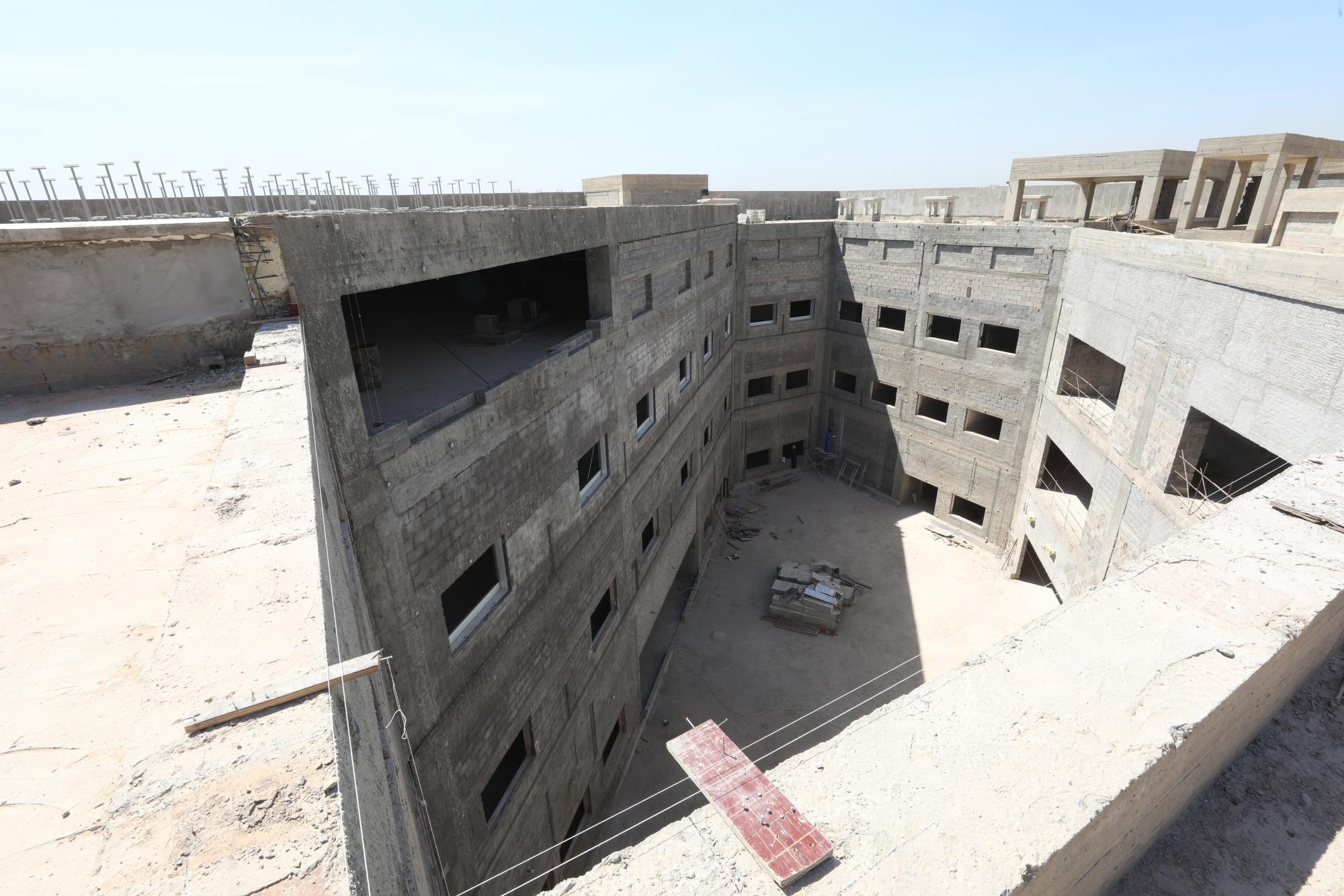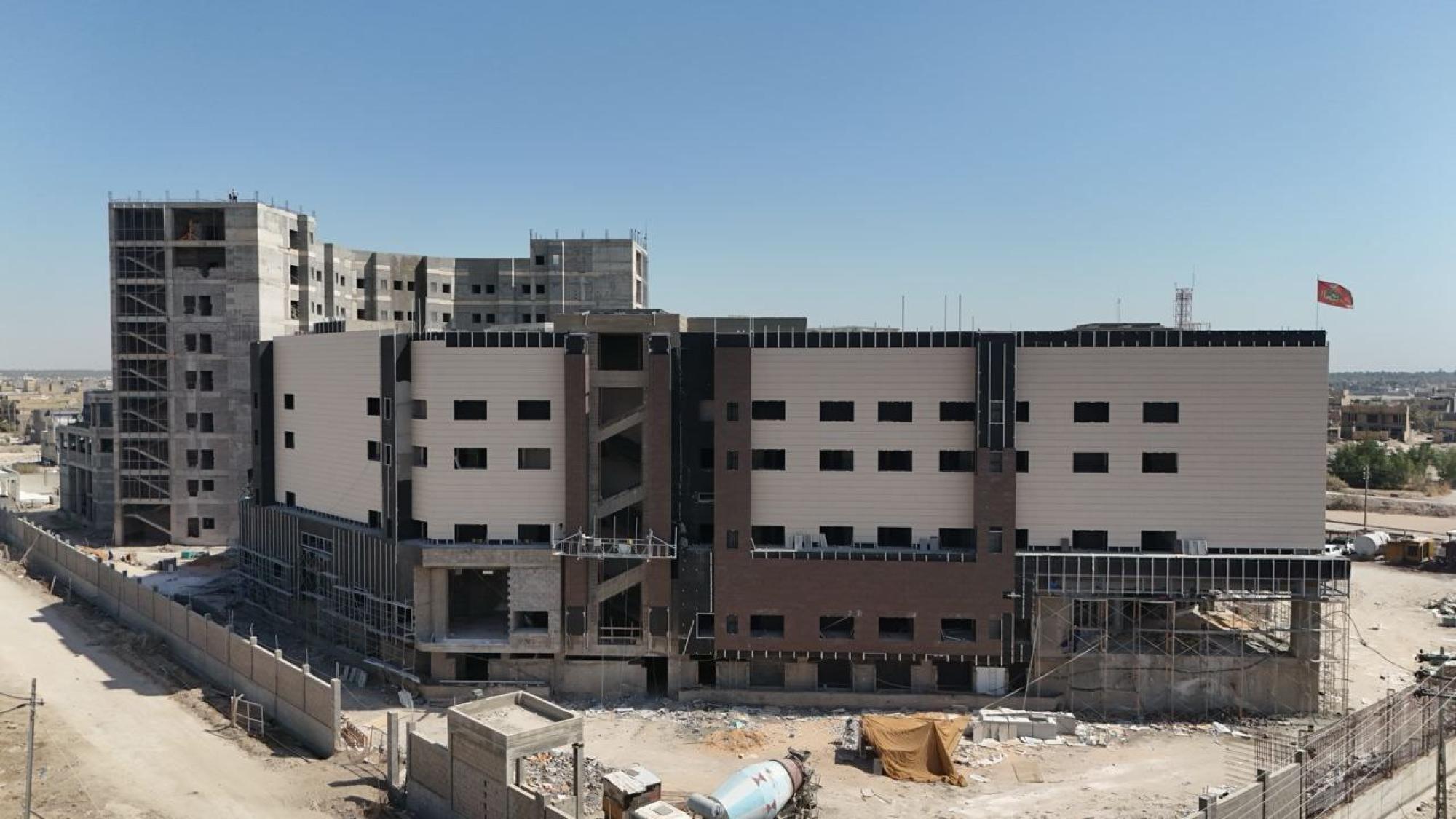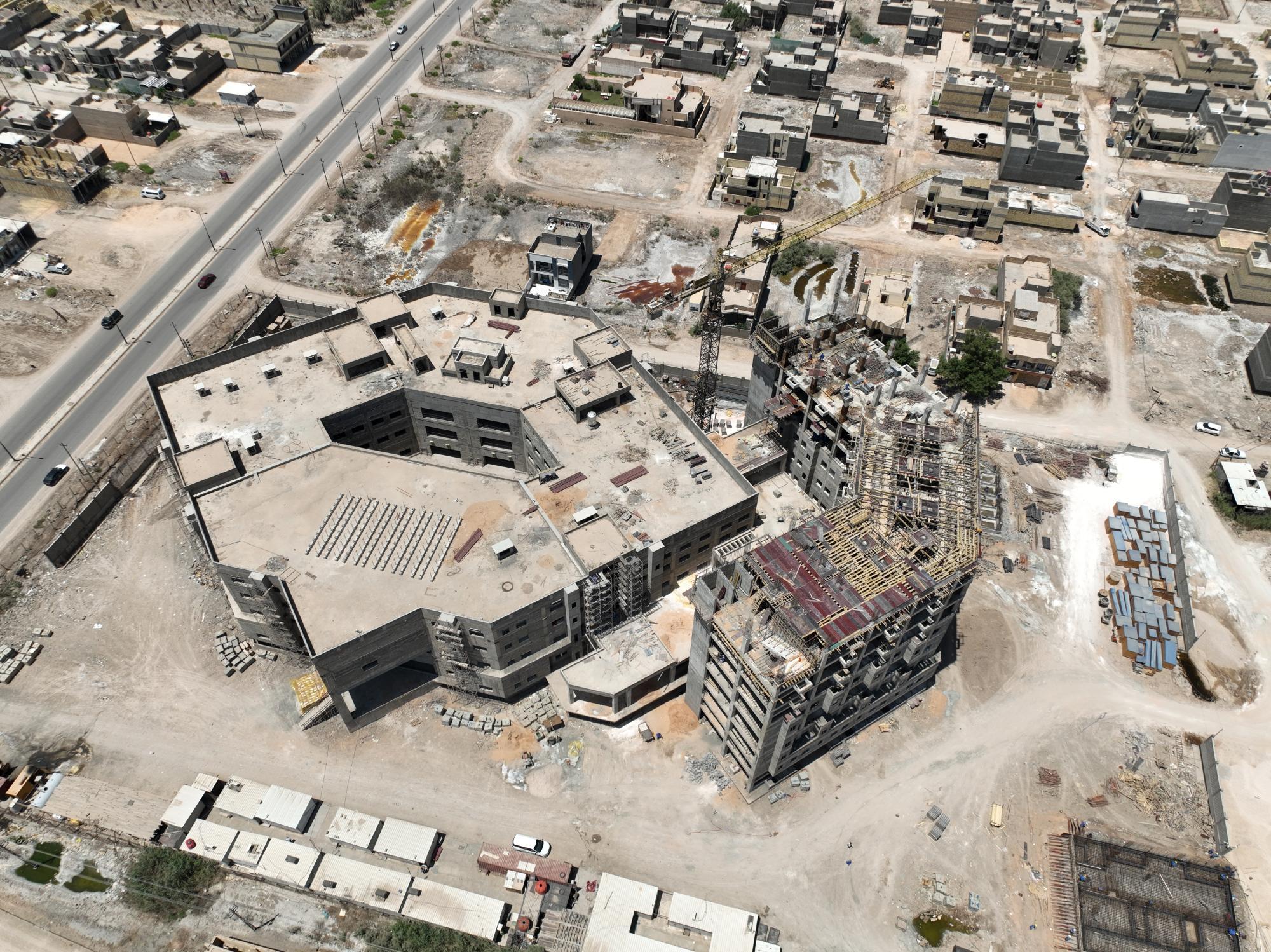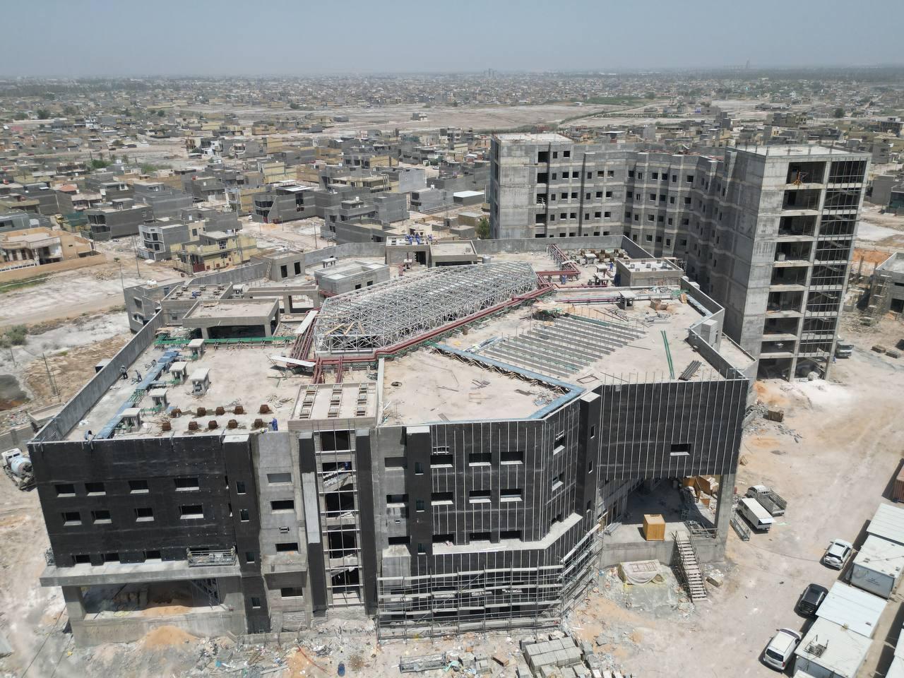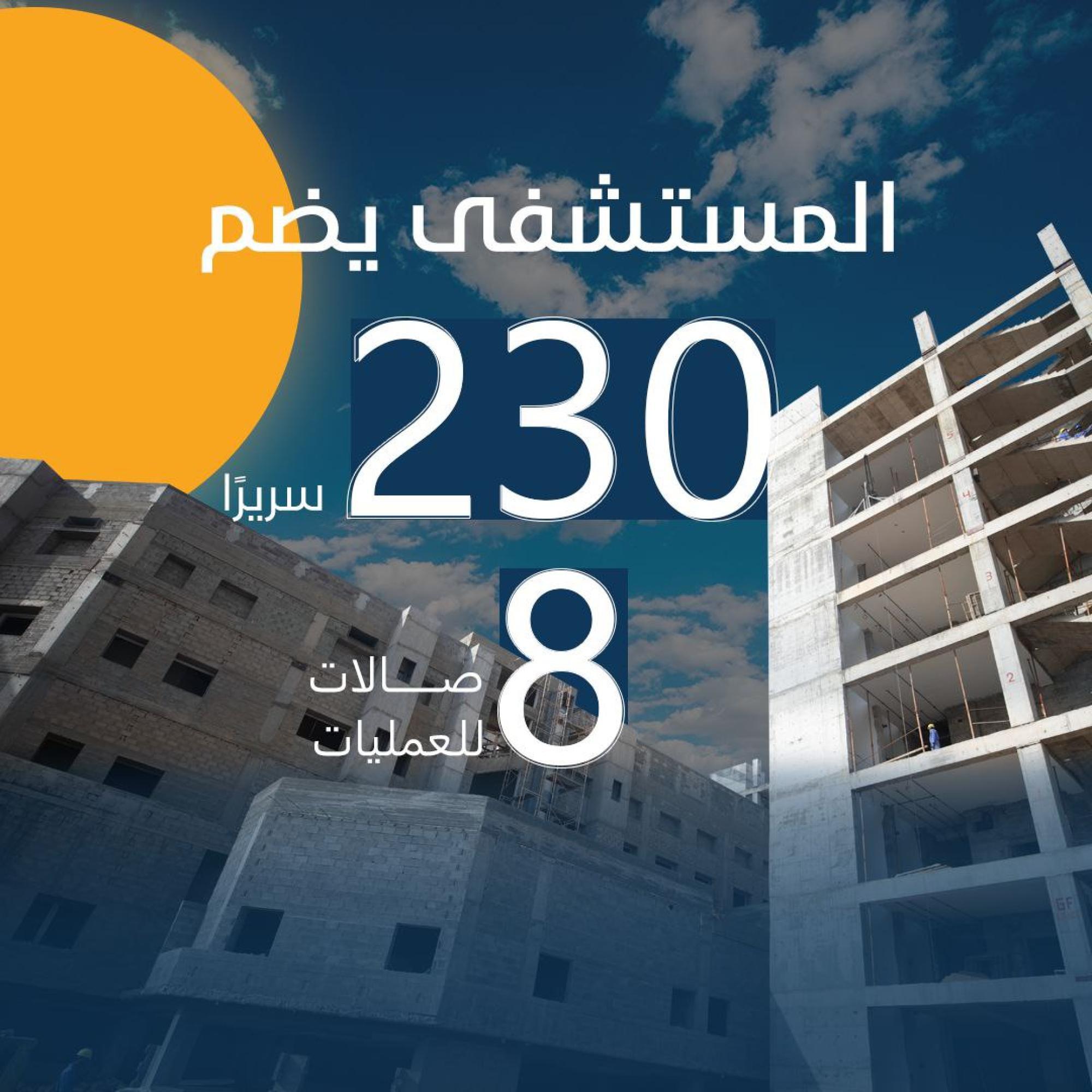 سعة المستشفى تبلغ (100) سرير ويُقام على مساحة بـــ(16,200 م2) ويتكون من ثلاثة طوابق وطابق تحت أرضي (سرداب) وبمساحة إجمالية (21,000 م2) ، ويبلغ إرتفاع المبنى (20 م) مضافاً لها بناية ثانوية للخدمات ، ويتكوّن من بنايتين الأولى هي بناية رئيسية للمستشفى ، والثانية هي بناية الخدمات وموقف السيارات مع مناطق خضراء ، واعتُمِد في تنفيذ المستشفى على بناء الهيكل الكونكريتي والأسس الحصيرية (raft foundation) والتقطيع الكونكريتي ، مع إستخدام التقنيات الحديثة كافة في أعمال الإنهاءات من الداخل والخارج والتي تشمل (التبريد المركزي الأعمال الكهربائية ، الأعمال الصحية) مع المنظومات الخدمية كافة) منظومة الإستدعاء ، منظومة إطفاء الحريق ، منظومة الكاميرات ، منظومة الإتصالات ، منظومة الغازات.