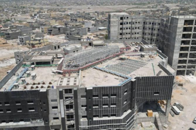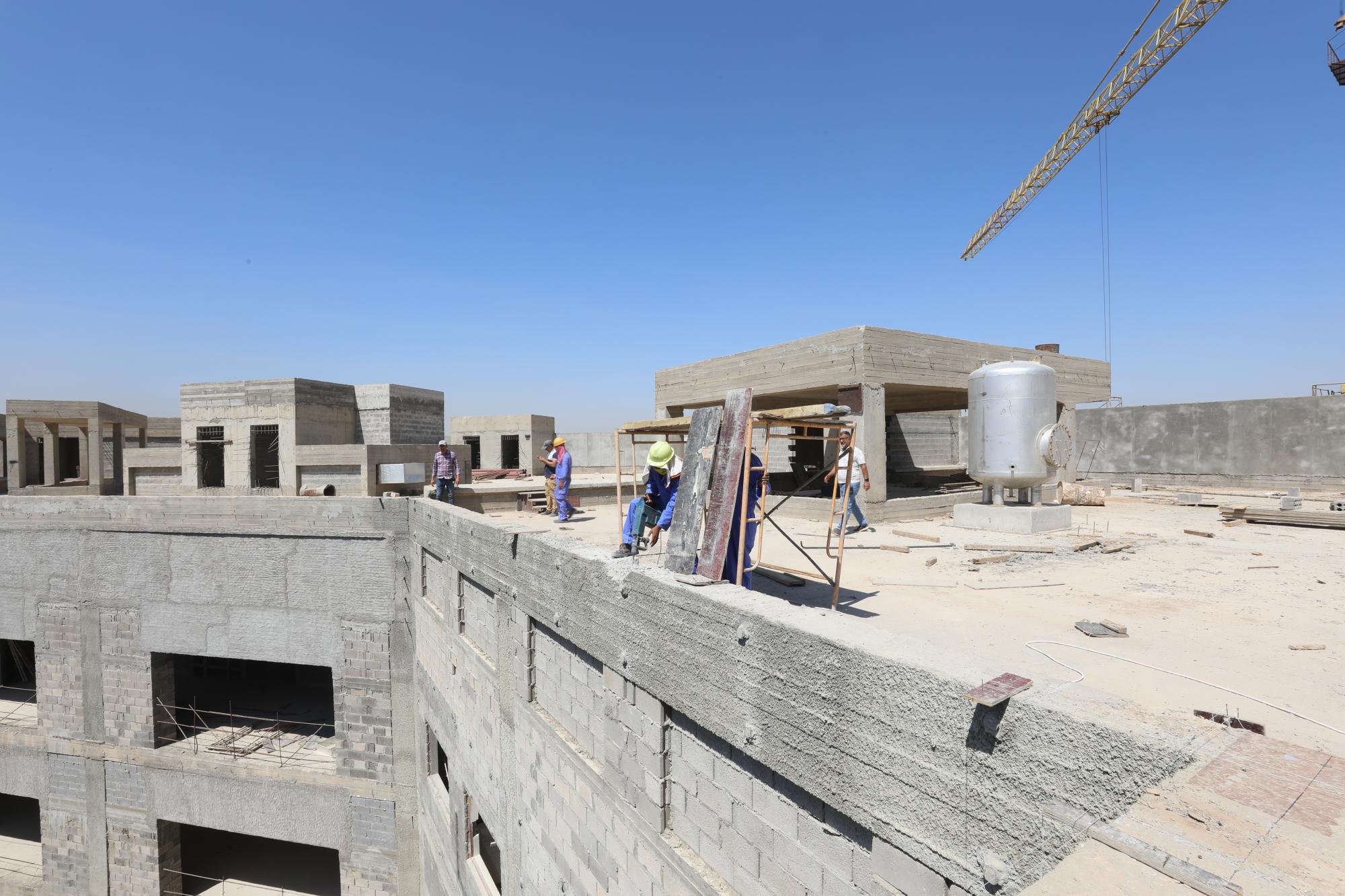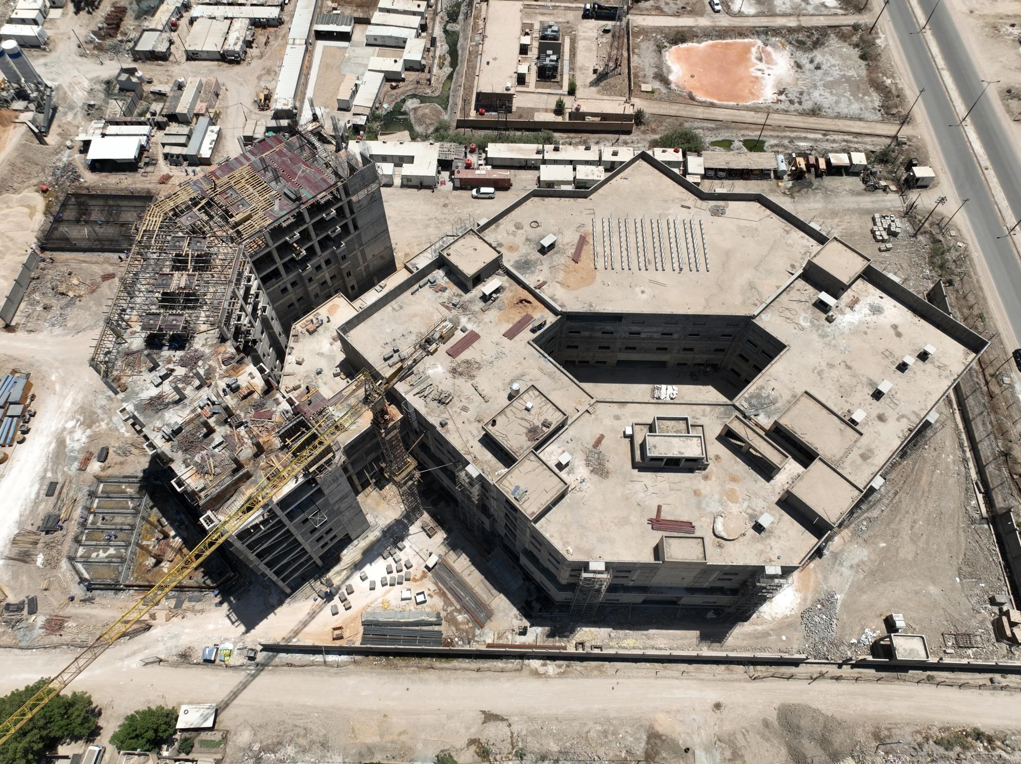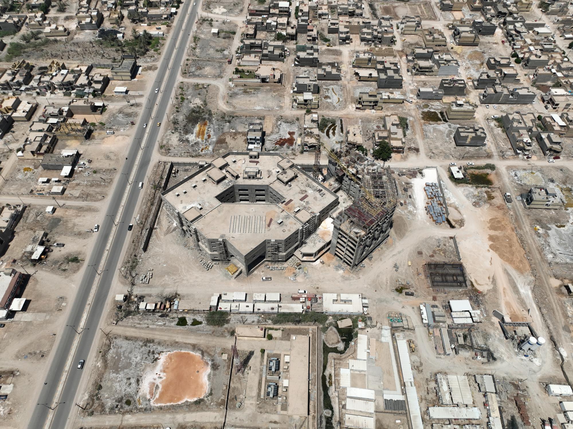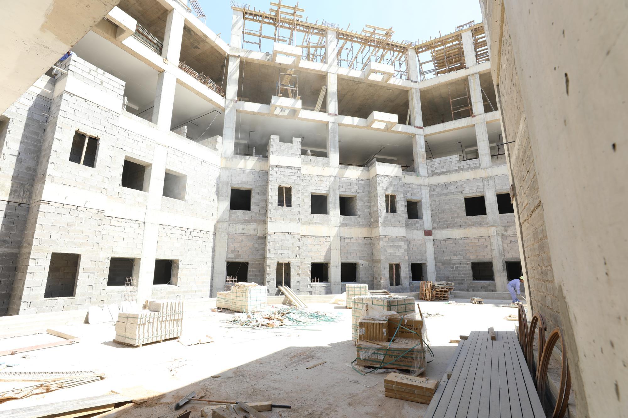 سعة المستشفى تبلغ (100) سرير ويُقام على مساحة بـــ(16,200 م2) ويتكون من ثلاثة طوابق وطابق تحت أرضي (سرداب) وبمساحة إجمالية (21,000 م2) ، ويبلغ إرتفاع المبنى (20 م) مضافاً لها بناية ثانوية للخدمات ، ويتكوّن من بنايتين الأولى هي بناية رئيسية للمستشفى ، والثانية هي بناية الخدمات وموقف السيارات مع مناطق خضراء ، واعتُمِد في تنفيذ المستشفى على بناء الهيكل الكونكريتي والأسس الحصيرية (raft foundation) والتقطيع الكونكريتي ، مع إستخدام التقنيات الحديثة كافة في أعمال الإنهاءات من الداخل والخارج والتي تشمل (التبريد المركزي الأعمال الكهربائية ، الأعمال الصحية) مع المنظومات الخدمية كافة) منظومة الإستدعاء ، منظومة إطفاء الحريق ، منظومة الكاميرات ، منظومة الإتصالات ، منظومة الغازات.