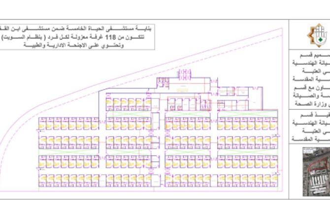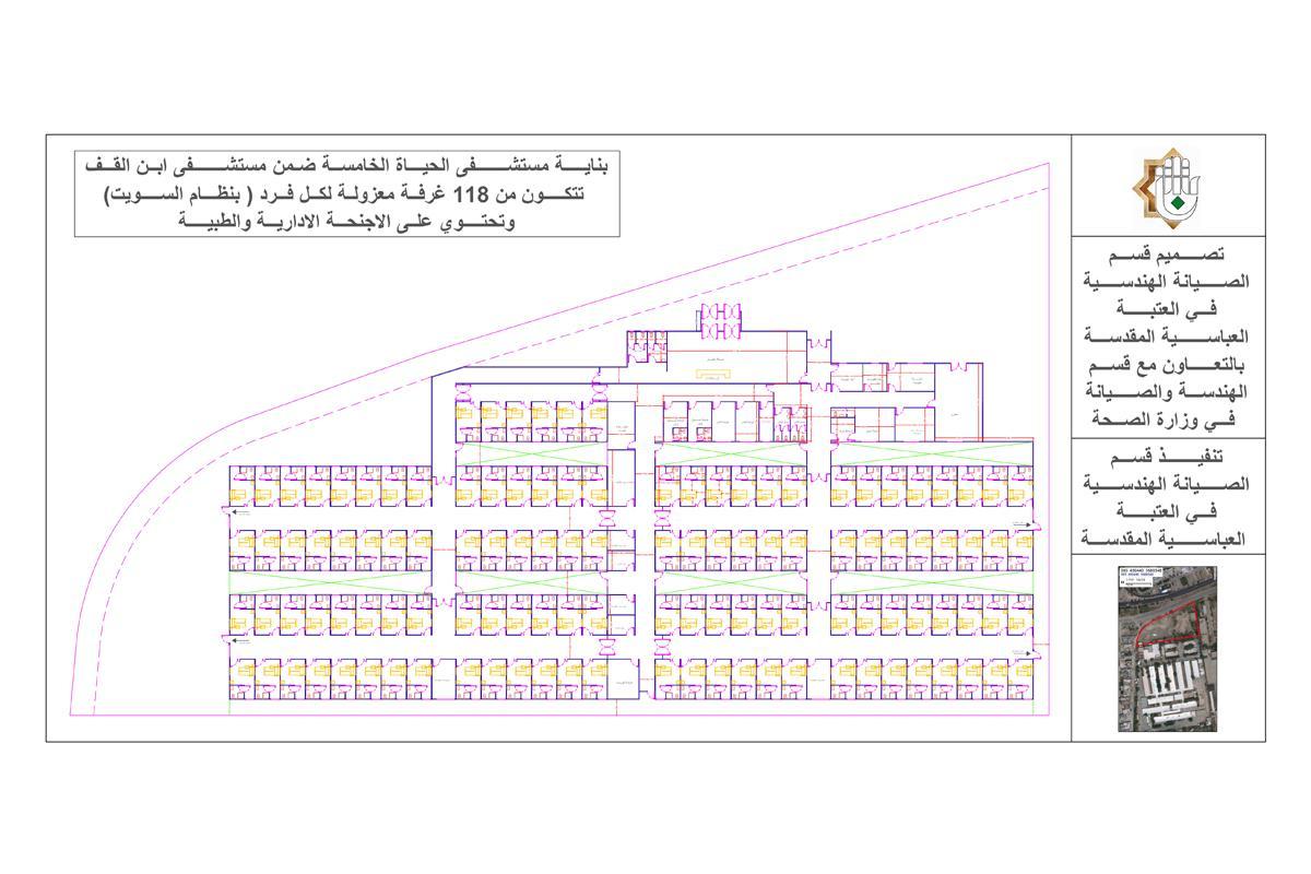 تعتبر من أكبر البنايات التي أنشأتها العتبة العباسية المقدسة ، تُقدّر مساحـة الـمـشــروع بــ(5,000) متر مربع ، مقسمة الى (118) غرفةً معزولة ومفردة (نظام سويت) مزودة بوحدة صحية منعزلة وبأبعاد (2x1,25) م ، وأبعاد الغرفة الواحدة (53) م أي بمساحة (15) م2 موزّعة على أجنحة ، إضافةً الى أكثر من (20) غرفة تنوّعت بين الطبّية والإدارية والخدمية وزّعت على ثلاثة أجزاء.