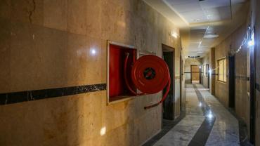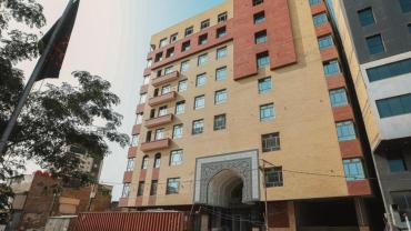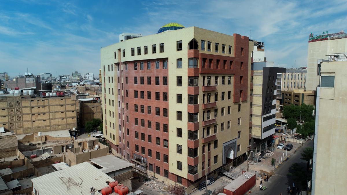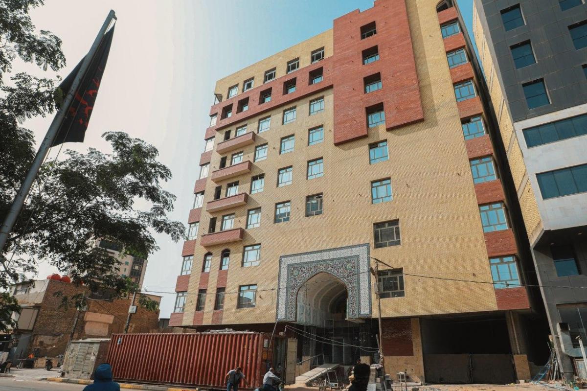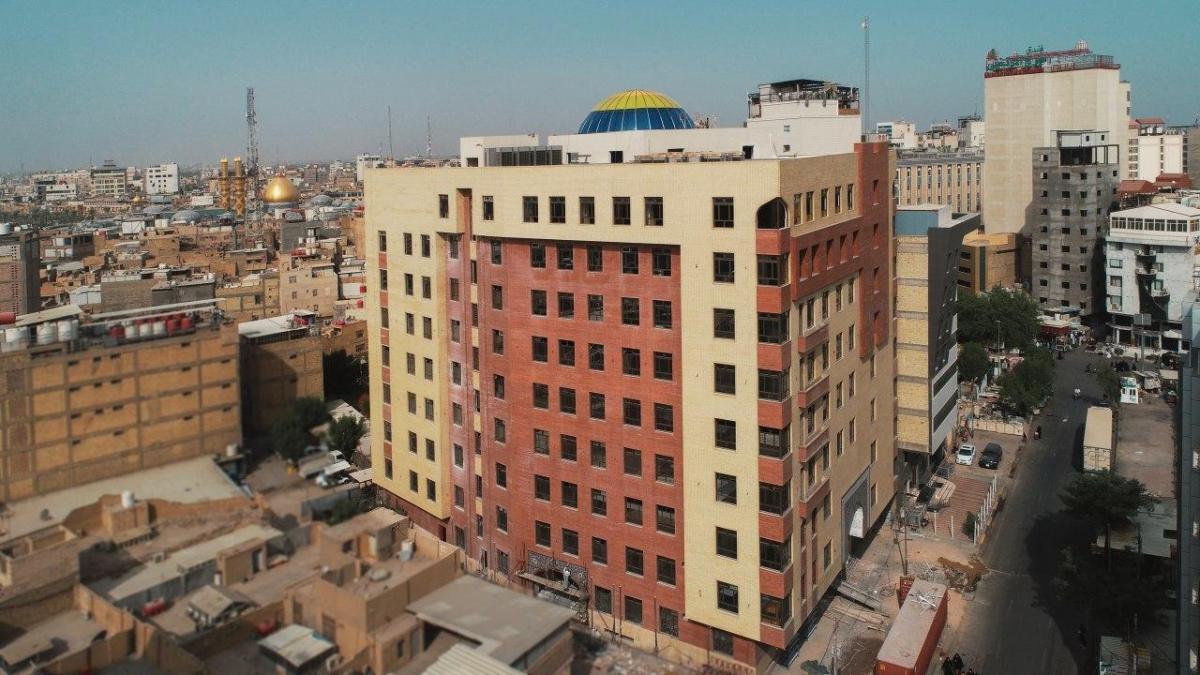 يُقام على أرضٍ مساحتها (1.500) م2، وبواقع 8 طوابق وسرداب للسيارات والذي أُنشئ وفق مواصفاتٍ عالية الجودة من ناحية التصميم والإنشاء، إضافةً إلى إحتوائه على مجموعةٍ من المفاصل المهمّة، منها منظوماتٌ خدميّة تساهم بشكلٍ مباشر في تسيير العمل، كمنظومة الإنذار المبكّر والحرائق ومنظومة التبريد المركزي، يُضاف إليها منظومة المراقبة الأمنيّة والأنترنت، مع إحتوائه على مركزٍ صحّي يخدم أهالي المنطقة، تبلغ مساحة الطابق تحت الأرضي (1.100) م2 ويُستغلّ كمرآبٍ للعجلات، أمّا الطابق الأرضيّ فهو صالة إستقبالٍ إضافةً الى مرفقٍ خدميّ، ومن الطابق الأوّل إلى الثامن أُستُثمِرَ لأقسام العتبة وبمساحةٍ تبلغ (1.250 م2) للطابق الواحد.