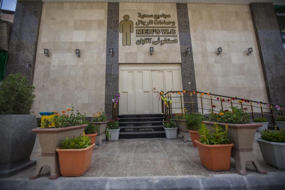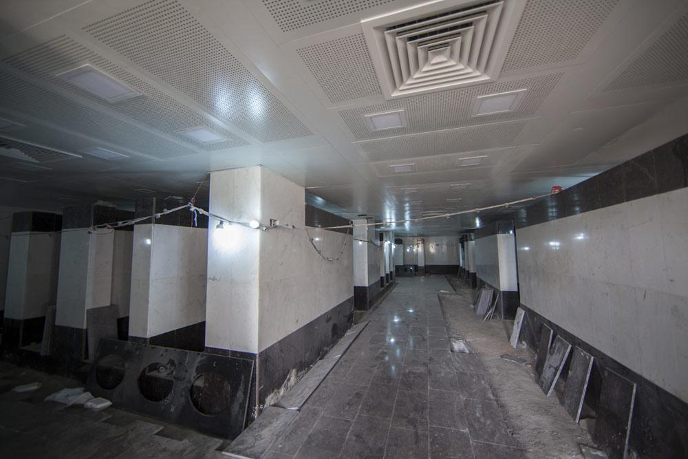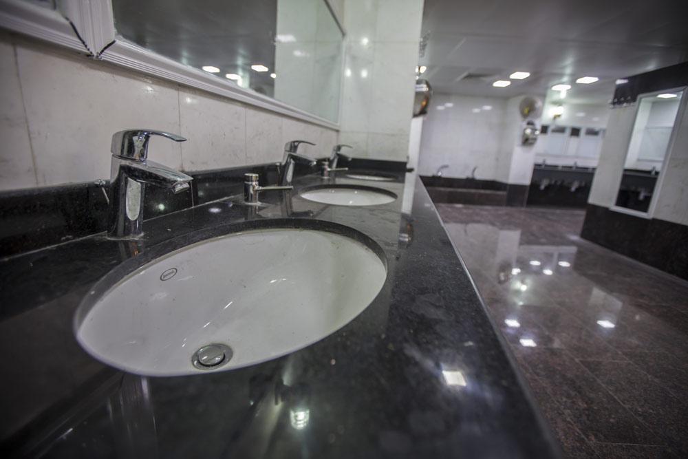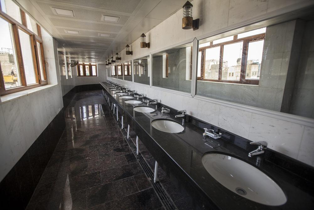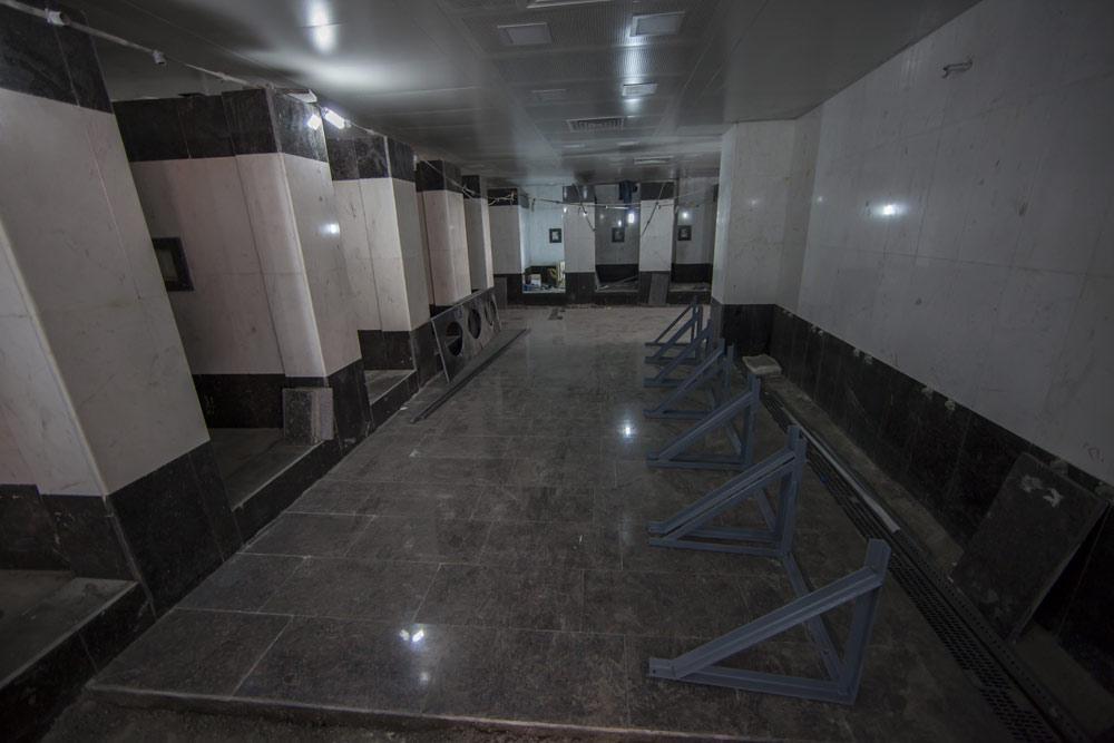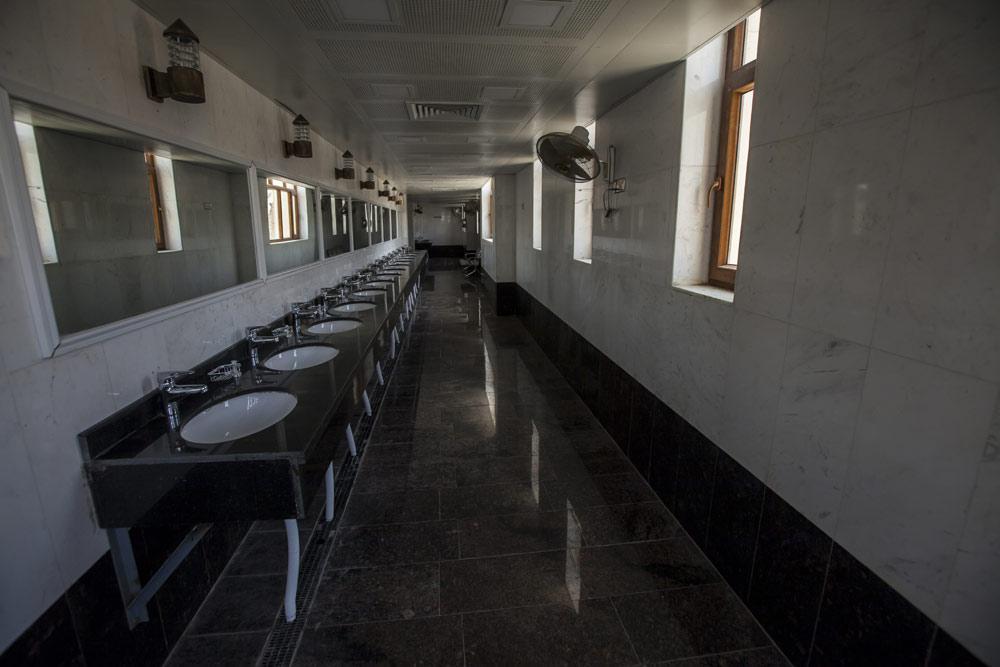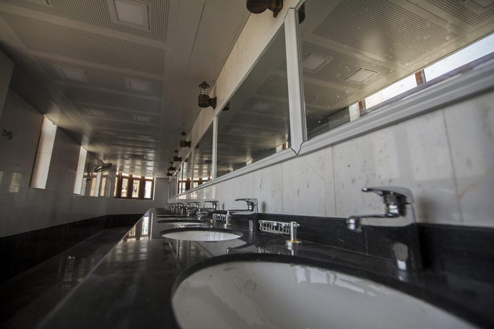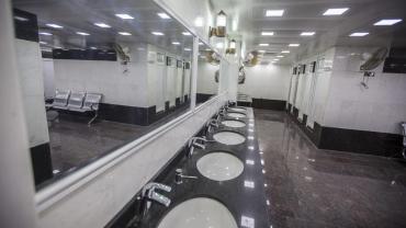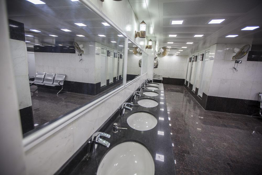 يقع على مساحةٌ تبلغ (331,4 م2) بواقع ثلاثة طوابق اشتملت على (181) وحدة صحّية، (88) منها خاصّة بالنساء و (90) خاصّة بالرجال و (3) منها لذوي الاحتياجات الخاصة، مع أماكن للوضوء وأخرى لغسل الأرجل، زُوّد المشروعُ بمنظومات متطوّرة لدفع الهواء، ومنظومة الصابون السائل، ومنظومة إنارة وإنذار وتغذية مائية، إضافةً لمنظومةٍ متكاملة للصرف الصحيّ، وتمّ تغليف الواجهات الخارجية للمبنى بحجر المرمر، والأرضيات بالسيراميك، كذلك تمّ تزويده بنظام إنارة متكامل، ومنظومة مانعة الصواعق, مع نظام التأريض ونظام التكييف والتدفئة، ونظام التهوية.