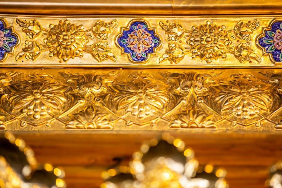 - صُممت وصنعت بأيدي عراقيّة من خَدَمة مرقد أبي الفضل العباس (عليه السلام). - النقوش والزخارف استوحيناها فنّياً من شباك مرقد أبي الفضل العباس وأخته العقلية زينب (عليهما السلام) ، لترجمة جزء بسيط من أخوتهما الصادقة وعلاقتهما الوطيدة. - إستخدمت في صناعة الأجزاء المعدنية والخشبيّة مواد ذات كفاءة ومن مناشئ عالميّة معتبرة. - يعتبر السقف والتاج أوّل جزء تتم صناعته لمرقد خارج العراق ، وهذا بحد ذاته رسالة بأن العقول والأيادي العراقية قادرة على صناعة مثل هكذا أعمال. - الحرفية والمهنية في الصناعة قد ترجمت بخلق حالةٍ من التناغم الفنّي والزخرفي بين الأجزاء الجديدة والقديمة. - الوزن الكلي للسقف والتاج بلغ (550 كغم). - إستخدم في صناعته ما يقارب (250 كغم) من النحاس. - إستخدم في طلاء أجزائه وزخارفه (2 كغم) من الذهب عيار (24) قيراطاً. - وزن الخشب المستخدم في صناعة الهيكل الخشبي قرابة الـ (300 كغم). - يبلغ طوله (4,15) م ، وعرضه (3,15 سم) وإرتفاعه (1,10 سم). - أستعمل في صناعته النحاس والخشب البورمي ، إضافةً الى الذهب المقدرة كميته بــ(2 كغم). - النقوش المستخدمة فيه هي نقوش نباتية إسلامية. - تم تصميم الزخارف والنقوش على يد مصمّمين يعملون في قسم صناعة أبواب وشبابيك الأضرحة. - التثبيت على الهيكل الخشبي بطريقةٍ مخفيّة ، ممّا جعله مع باقي الأجزاء كقطعة واحدة.