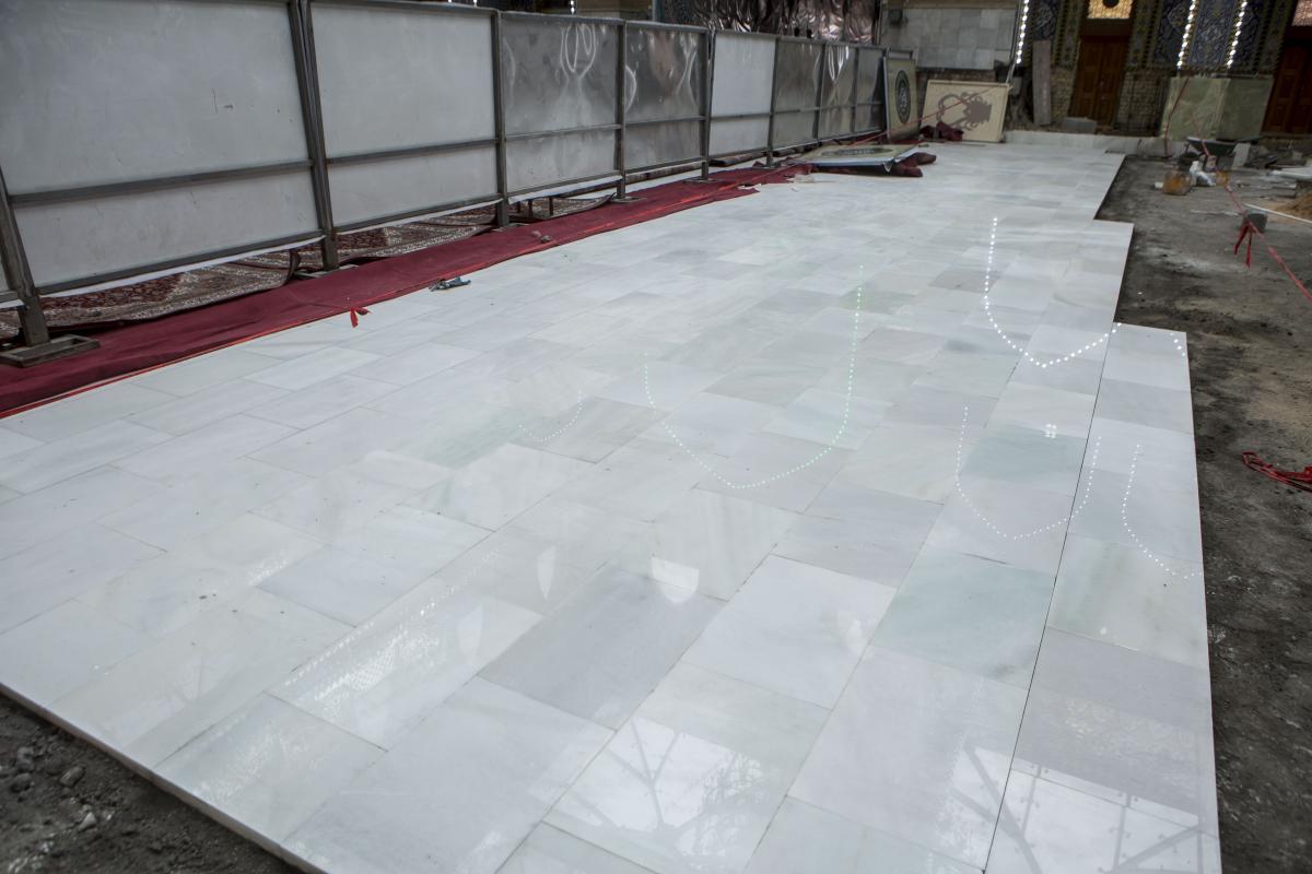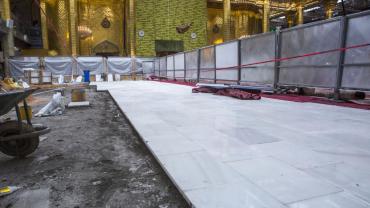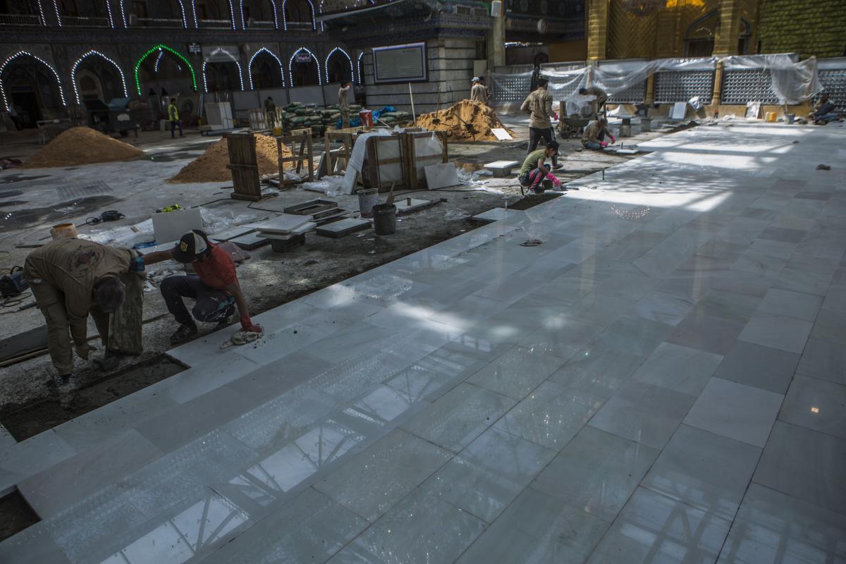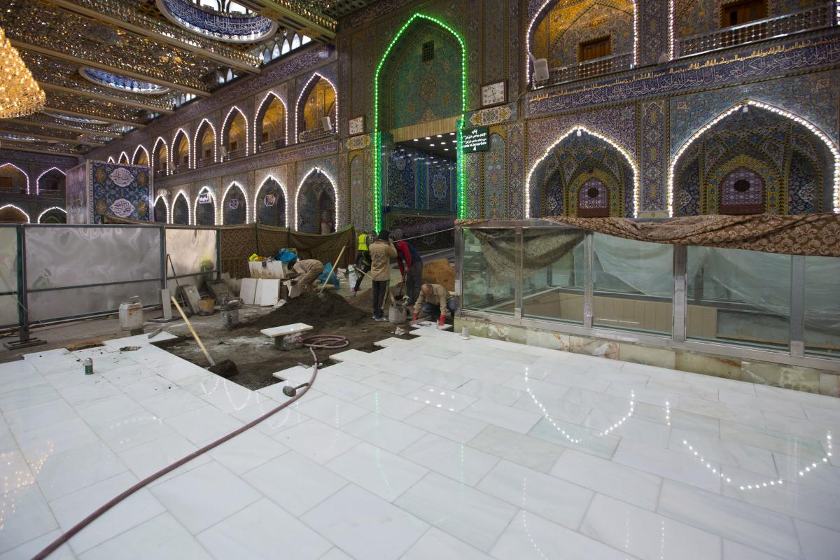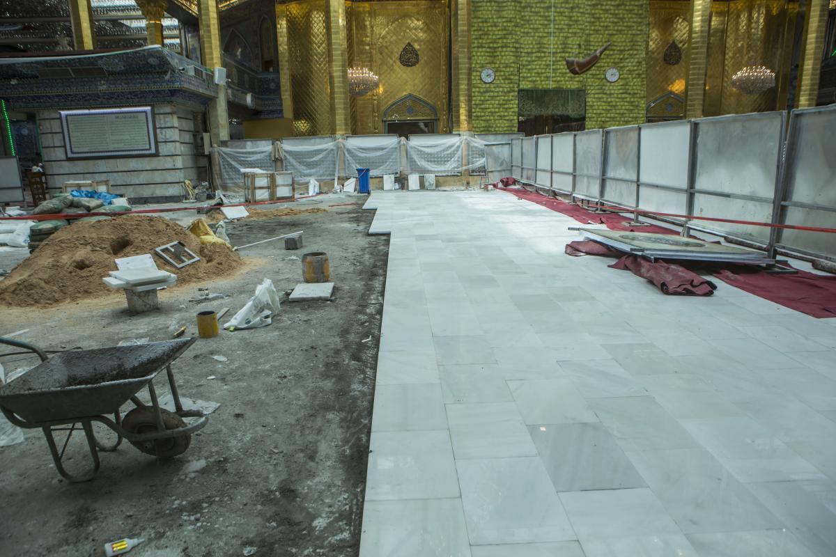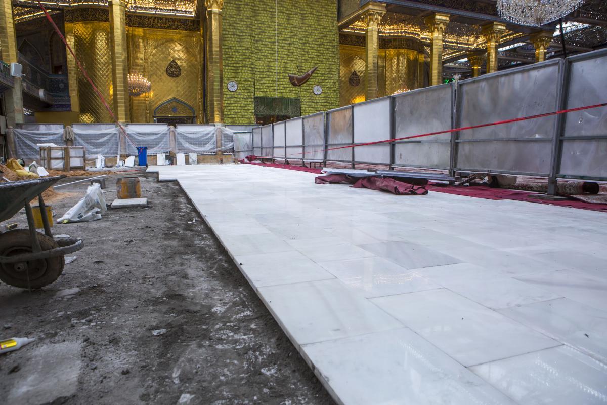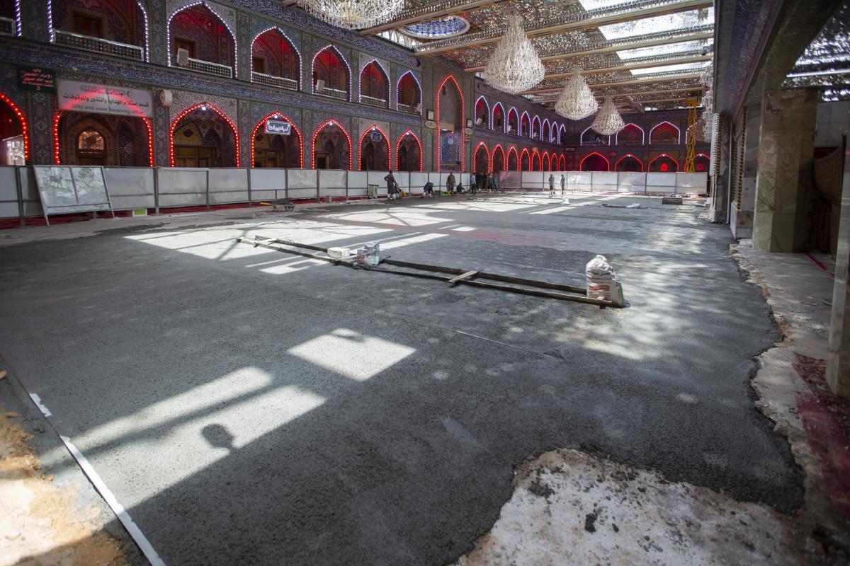 عمليّة الإكساء قسمت الى مراحل وكل مرحلة الى أجزاء ومقاطع فكانت المرحلة الأولى منه هي حرم أبي الفضل العبّاس (عليه السلام) الذي تبلغ مساحته (1000 متر مربع) ، وسبق هذا التقسيم إجراء مسح كامل للمشروع وعمل مخططات خاصة به ، وبنقوش وزخارف متناغمة مع باقي أجزاء العتبة العبّاسية المقدسة لخلق حالةٍ من التناظر والتناغم أن ، أما عن مواصفات المرمر فالمرمر الجديد الذي تم إكساء وتغليف أرضيّة الحرم به هو من نوع (ملتي الاونكس) بقياس 40 سم × 60 سم) وبسمك (3 سم) ، وأجريت عليه عدة فحوصات فنّية وهندسية من ناحية التحمّل وثباتيّة اللون والسمك إضافة الى مواصفات أخرى جعلت هذه القطع المرمرية غاية في الجمال والروعة.. يُشار الى أنه قد سبقت عمليّة الإكساء أعمال أولية منها: - رفع المرمر القديم. - رفع أجزاء الخرسانة القديمة وإصلاح المتضرر منها. - معالجة الأرضيّة وتشققاتها باستخدام مواد خاصة. - صب أرضية خرسانية تكون ممهدة للإكساء وبخرسانة ذات مواصفات خاصة ومعالجة بمواد إنشائية تُساعد على إلتصاقها بالأرضيّة القديمة وأخرى تمنع الرطوبة وغيرها. - عمل شبكة حديدية ووضعها تحت الصب الخرساني عمل شبكة أرضية لمنظومات تصريف المياه والإتصالات والحريق والإنذار ، وربطها بالصحن الشريف لترتبط بدورها بالمنظومات الرئيسية للعتبة العباسية المقدسة.