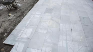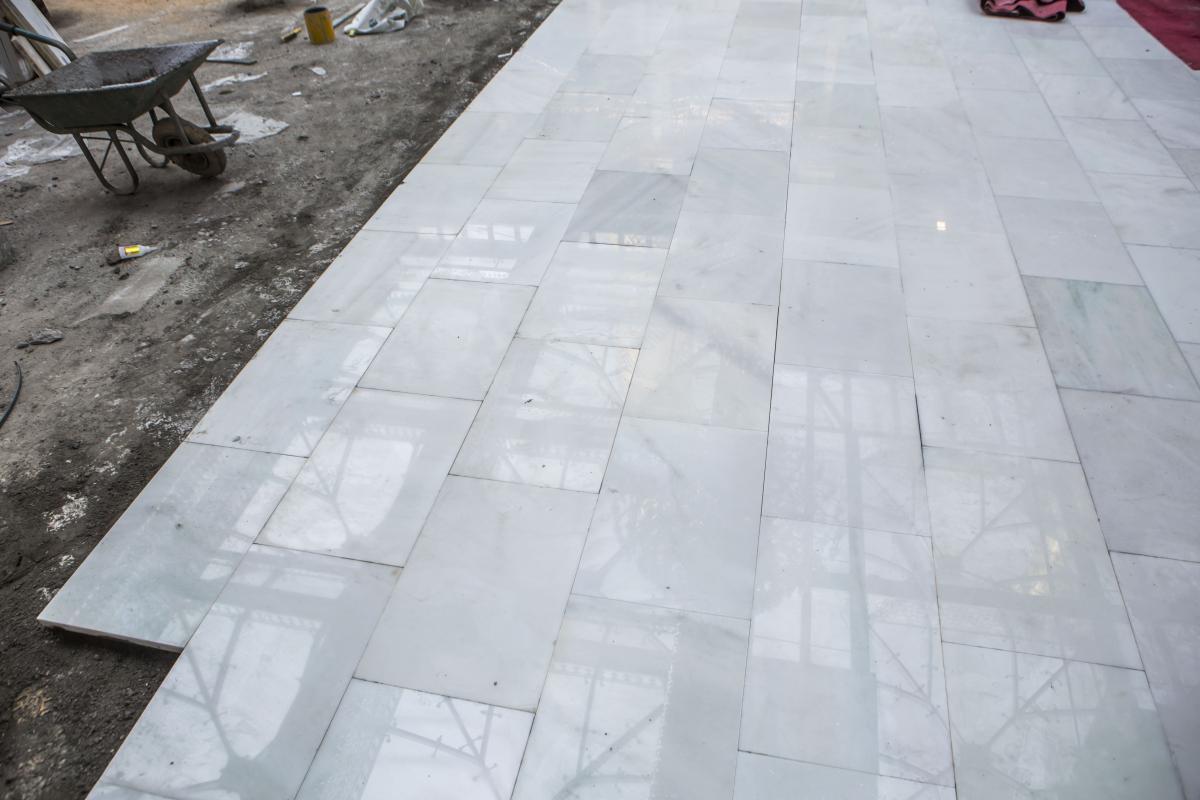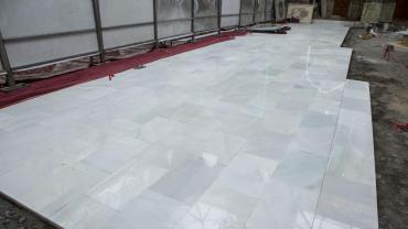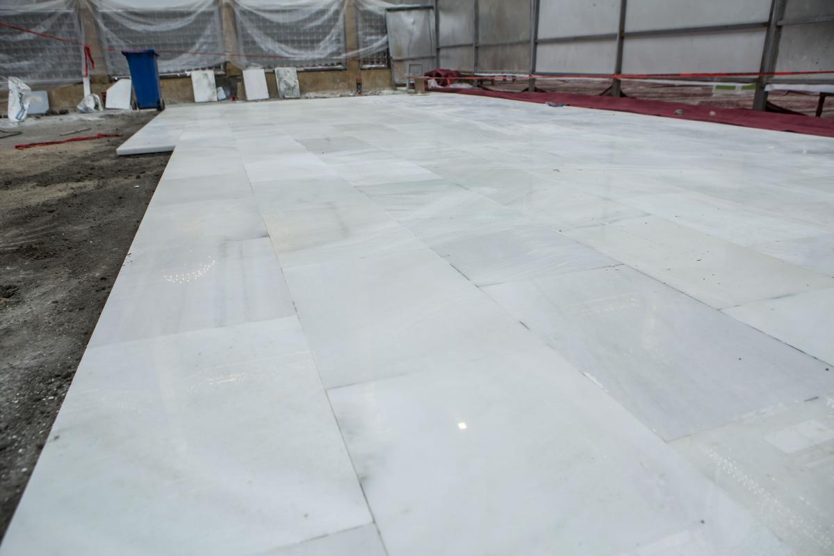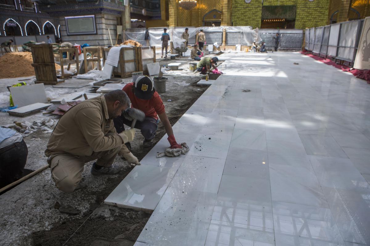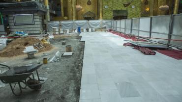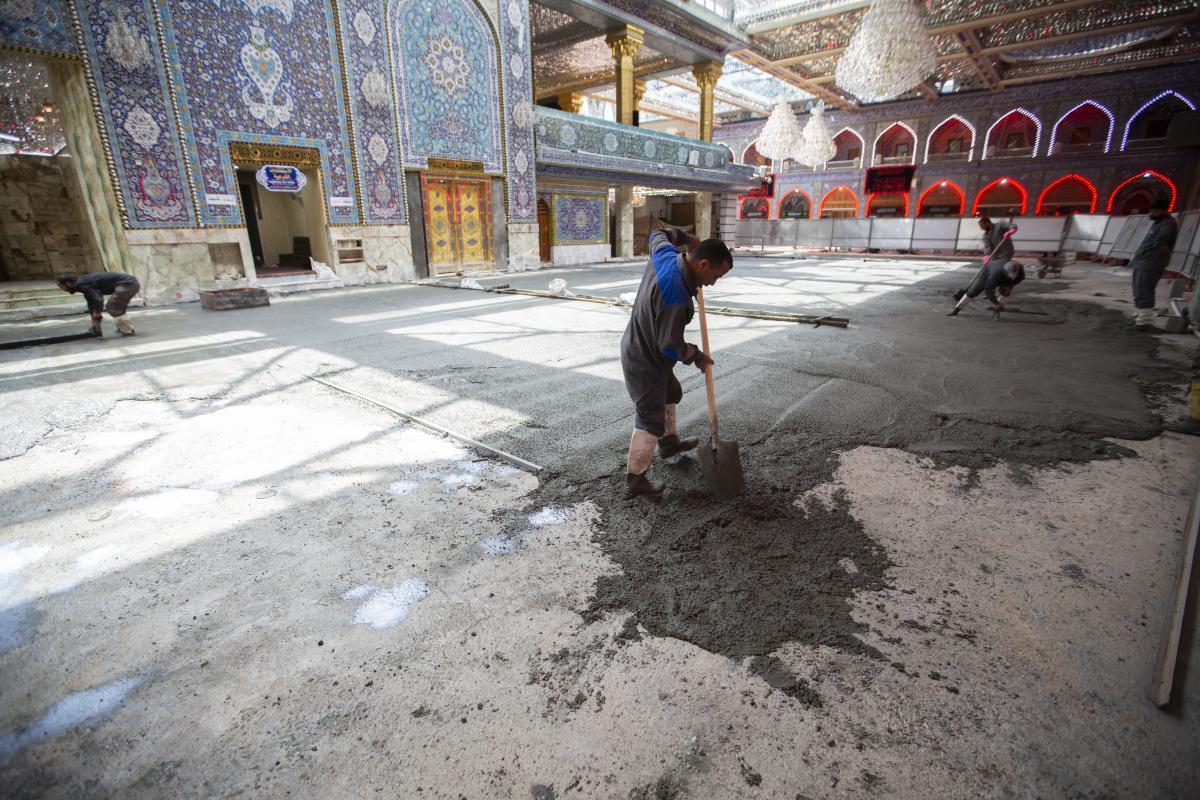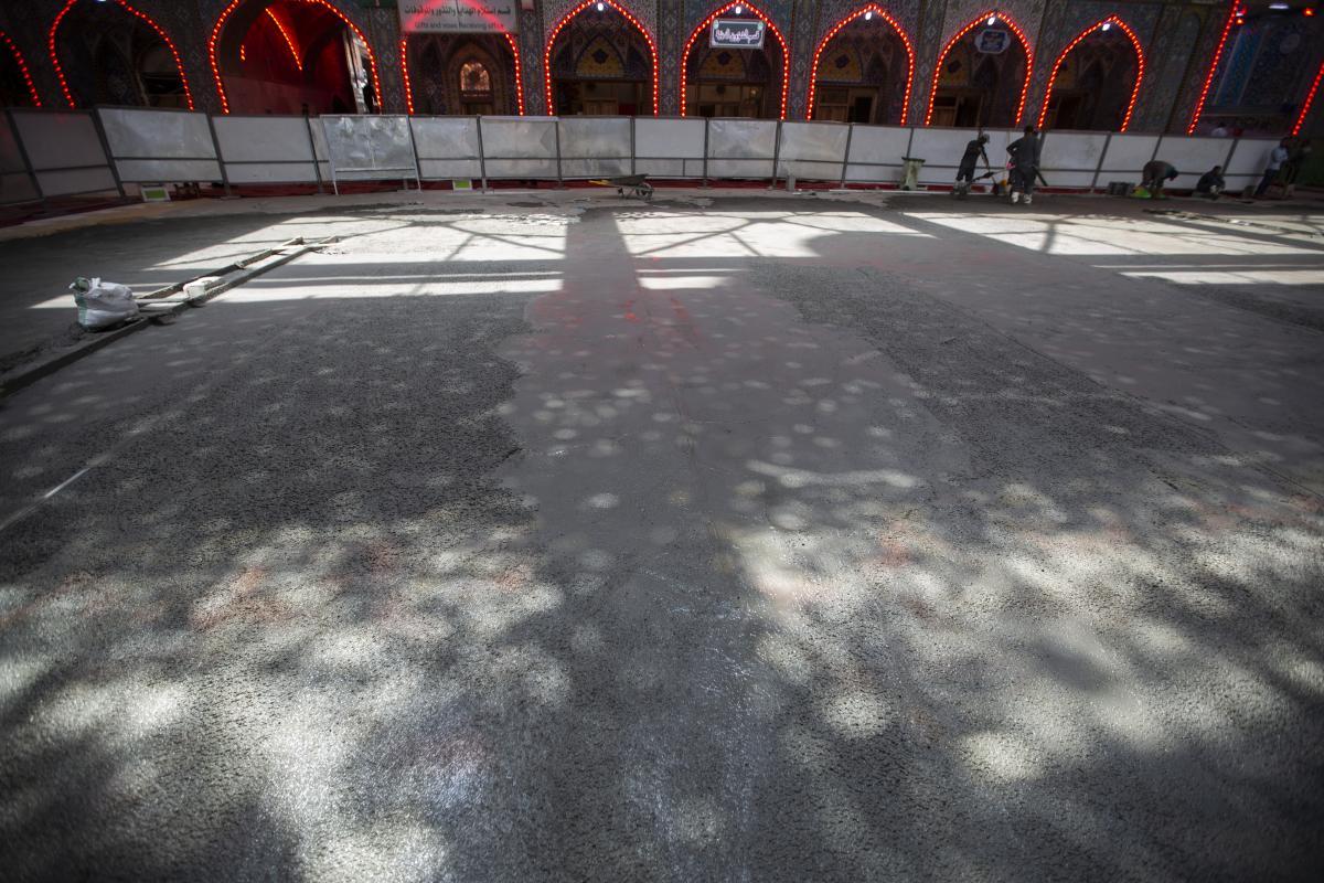 عمليّة الإكساء قسمت الى مراحل وكل مرحلة الى أجزاء ومقاطع فكانت المرحلة الأولى منه هي حرم أبي الفضل العبّاس (عليه السلام) الذي تبلغ مساحته (1000 متر مربع) ، وسبق هذا التقسيم إجراء مسح كامل للمشروع وعمل مخططات خاصة به ، وبنقوش وزخارف متناغمة مع باقي أجزاء العتبة العبّاسية المقدسة لخلق حالةٍ من التناظر والتناغم أن ، أما عن مواصفات المرمر فالمرمر الجديد الذي تم إكساء وتغليف أرضيّة الحرم به هو من نوع (ملتي الاونكس) بقياس 40 سم × 60 سم) وبسمك (3 سم) ، وأجريت عليه عدة فحوصات فنّية وهندسية من ناحية التحمّل وثباتيّة اللون والسمك إضافة الى مواصفات أخرى جعلت هذه القطع المرمرية غاية في الجمال والروعة.. يُشار الى أنه قد سبقت عمليّة الإكساء أعمال أولية منها: - رفع المرمر القديم. - رفع أجزاء الخرسانة القديمة وإصلاح المتضرر منها. - معالجة الأرضيّة وتشققاتها باستخدام مواد خاصة. - صب أرضية خرسانية تكون ممهدة للإكساء وبخرسانة ذات مواصفات خاصة ومعالجة بمواد إنشائية تُساعد على إلتصاقها بالأرضيّة القديمة وأخرى تمنع الرطوبة وغيرها. - عمل شبكة حديدية ووضعها تحت الصب الخرساني عمل شبكة أرضية لمنظومات تصريف المياه والإتصالات والحريق والإنذار ، وربطها بالصحن الشريف لترتبط بدورها بالمنظومات الرئيسية للعتبة العباسية المقدسة.