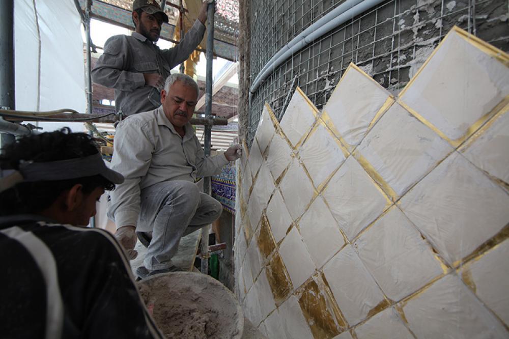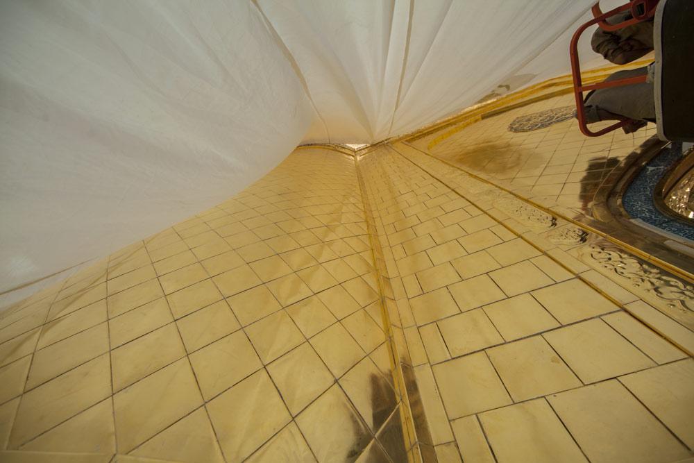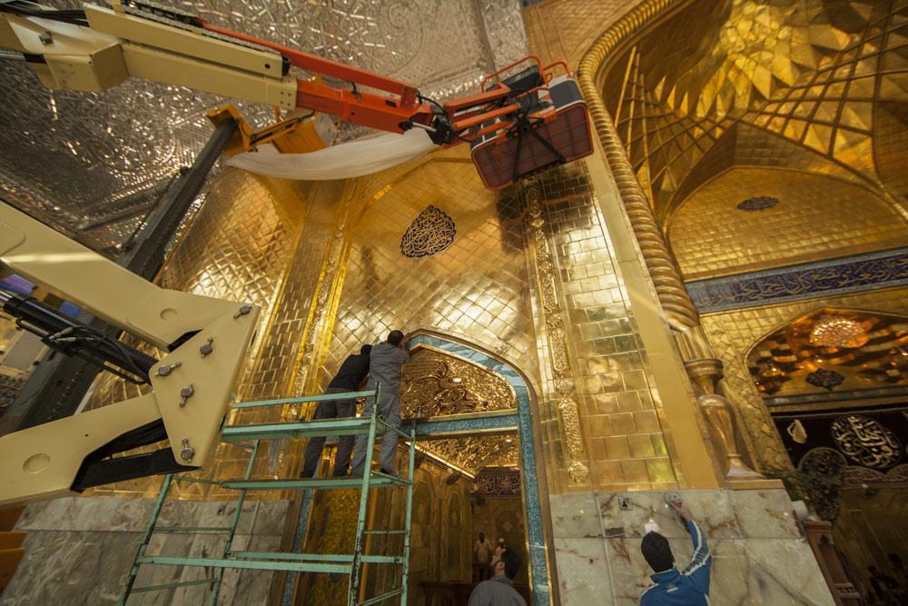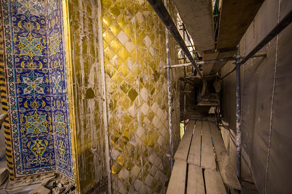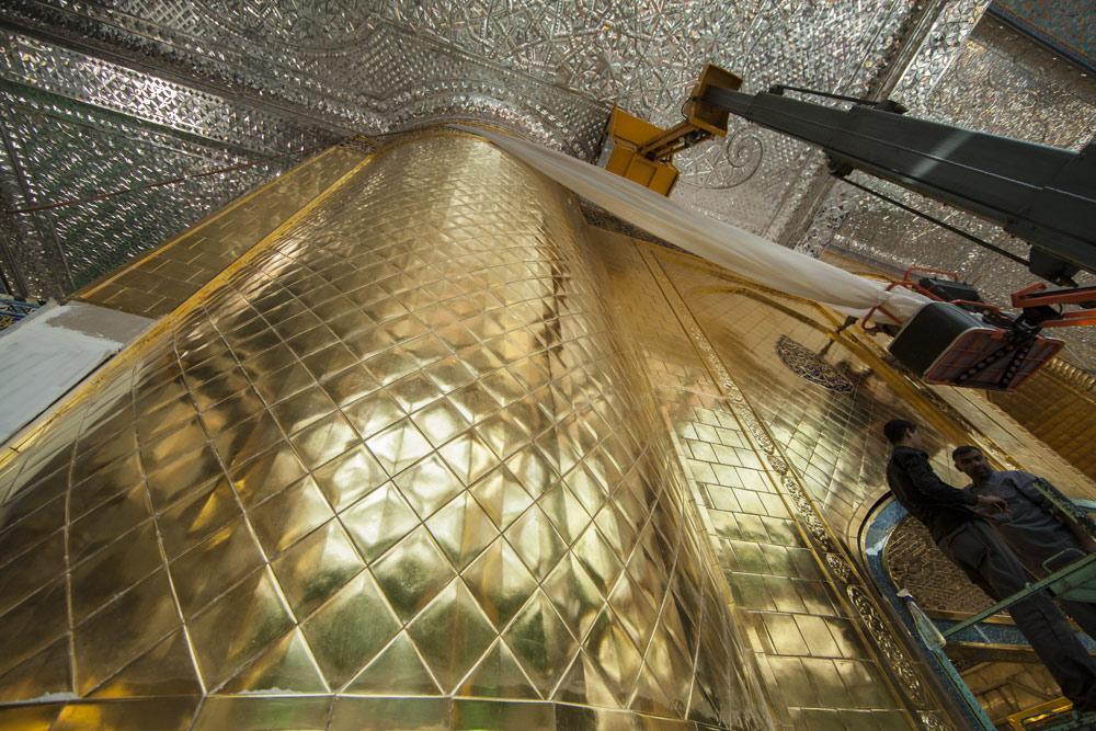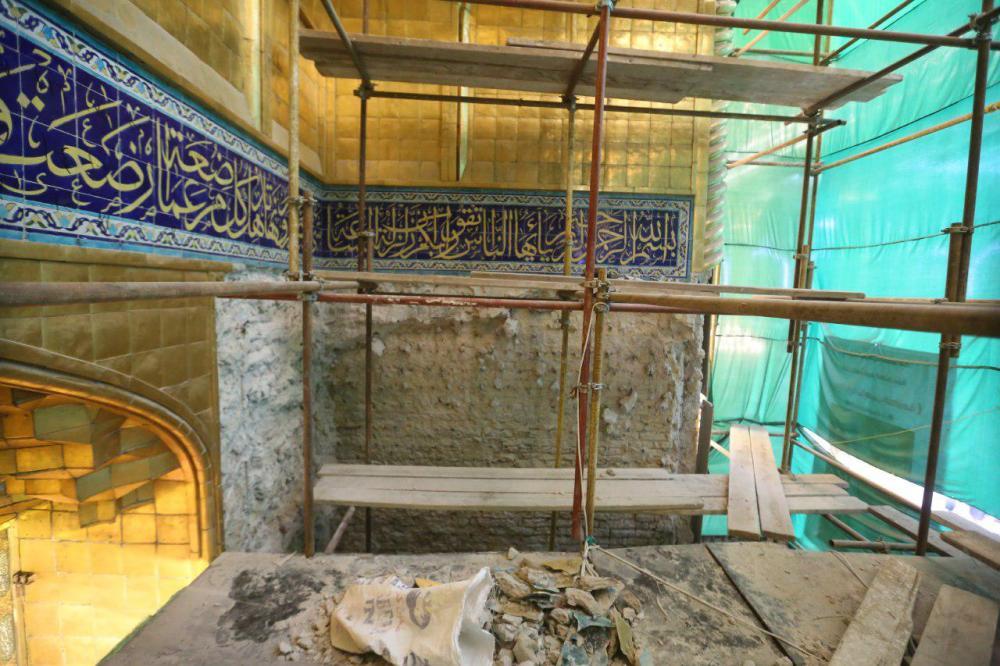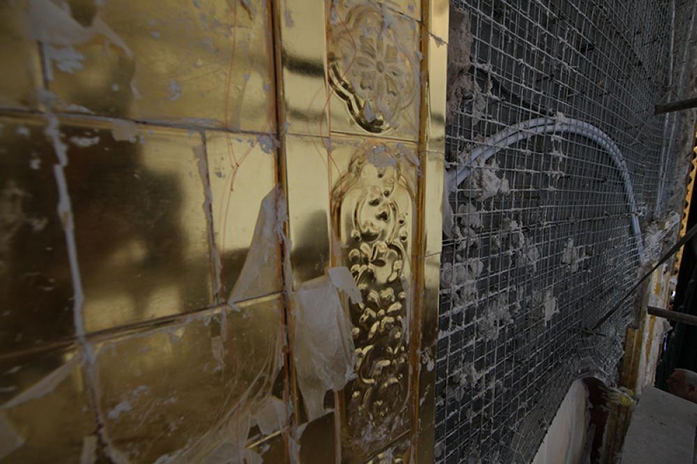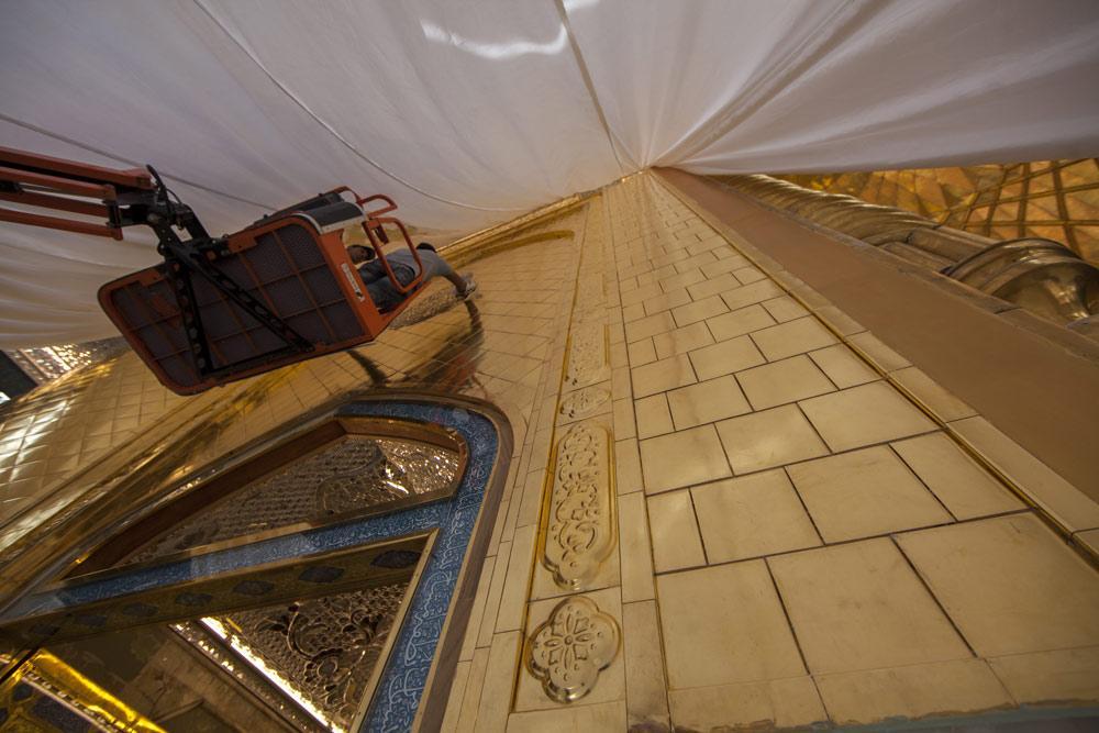 يقع المشروع على مساحة تقدر بـ (350) م2 ، تم إكساء هذا الجدار بالبلاطات (الطابوقات) الذهبية الجديدة بعد تركيب طبقات الهارب وطلسها بمادة الإسمنت بمساحة تقدر بــ(350) م2 وإستخدم في عمليات التذهيب الذهب عيار (24) بقياساتٍ مختلفة وبوزن (10 غرامات) من الذهب الخالص لكل بلاطة ذهبية ، والتي يبلغ سمك الواحدة منها (2 ملم) باستخدام أفضل التقنيات من ناحية العمر الإفتراضي وهي تقنية الطرق على جلد الغزال ، وإن البلاطات المُصنّعة تخضع لفحوصات جهاز التقييس والسيطرة النوعية في وزارة التخطيط العراقية ، وإنّ عملية ربط هذه البلاطات الذهبية كانت باستخدام طريقة الوصلة بواسطة المسامير اللولبية (البراغي) ، وهي من الطرق التي لا تؤثر عليها ولا على مظهرها الخارجي ، عكس الطريقة القديمة وهي طريقة الكبس (البراجم) ، والتي لها عيوب تظهر مستقبلاً على لون وشكل البلاطة الذهبية ، إنّ الكتيبة القرآنية التي تعلو جدار الطارمة تميّزت كذلك بميزات تختلف جذرياً عن الكتيبة القديمة ، حيث إستُخدمت فيها الخطوط والزخارف والآيات القرآنية المنقوشة على الذهب المطعم بالمينا الحارة ، والتي تعتبر من أجود أنواع المينا التي تتفاعل مع النحاس ، حيث تمتاز بمقاومتها وبريق لونها.