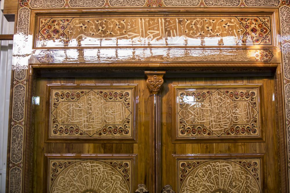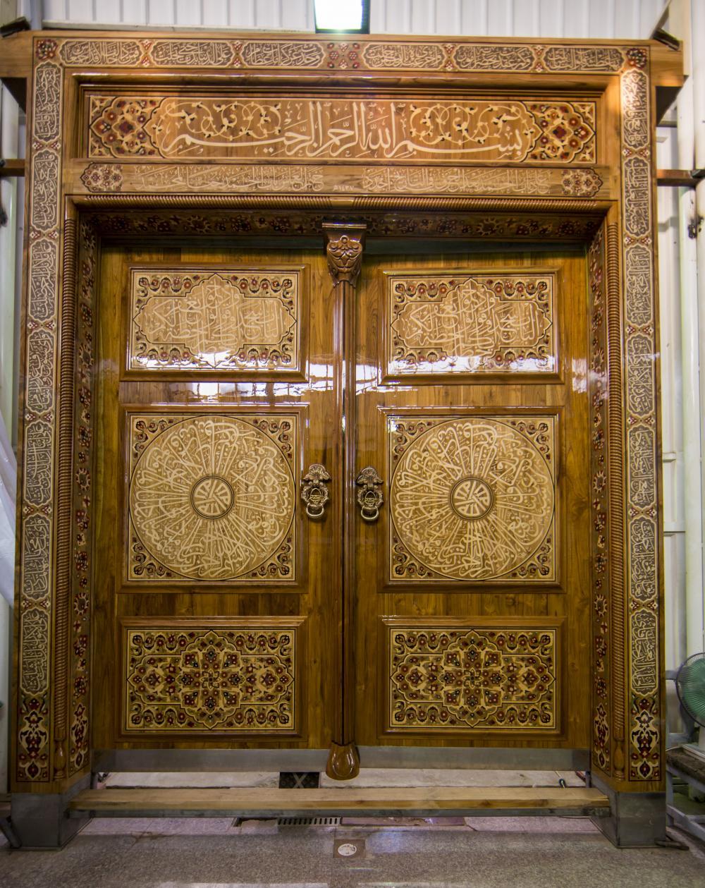1- يبلغ ارتفاع الباب (4,76) م وعرضه ( 3,90) م. 2- تبلغ ابعاد اطاره الخارجي (الفريم المحيط به) (30) سم × (30) سم. 3- يبلغ وزن الباب (1,5) طن. 4- ينقسم الباب الى مصراعين (طلاقتين) متناظرتين يبلغ سمك كل مصراع (9) سم. 5- يوجد في الإطار الخارجي شريط كتابي يحوي على (20) مقطعاً (طرة كتابية) ، والى الأسفل هناك شريط كتابي خط عليه عبارة البسملة ، وتحته شريط اخر خط عليه بيت شعري يؤرخ هذا العمل ، كما أن الخطوط المستخدمة هي الكوفي والثلث. 6- إستخدم في صناعة هذا الباب خشب الصاج البورمي حيث تم إستخدام (130) فوتاً مكعباً منه. 7- إستخدم خشب طبيعي للتلوين وبلغت كميته (10) فوتات. 8- تم استخدام شبكة داخلية من أنابيب غير مجوفة من مادة الاستلنس استيل وبمسافة (30) سم بين كل انبوب واخر لإعطائه القوة والمتانة. 9- الأغلفة من مادة الأستلنس استيل تكون على شكل حاضنات علوية وسفلي بمقدار سمك كل مصراع لحمايته من عوامل البيئة الخارجية. 10- يفصل بين المصراعين عمود تعلوه زخرفة ، ويرتكز على جزء زخرفي آخر. 11- ركبت في أوسط الباب حلقتان متحركتان خط عليهما يا أبا جعفر ويقصد به السيد محمد (عليه السلام).