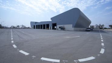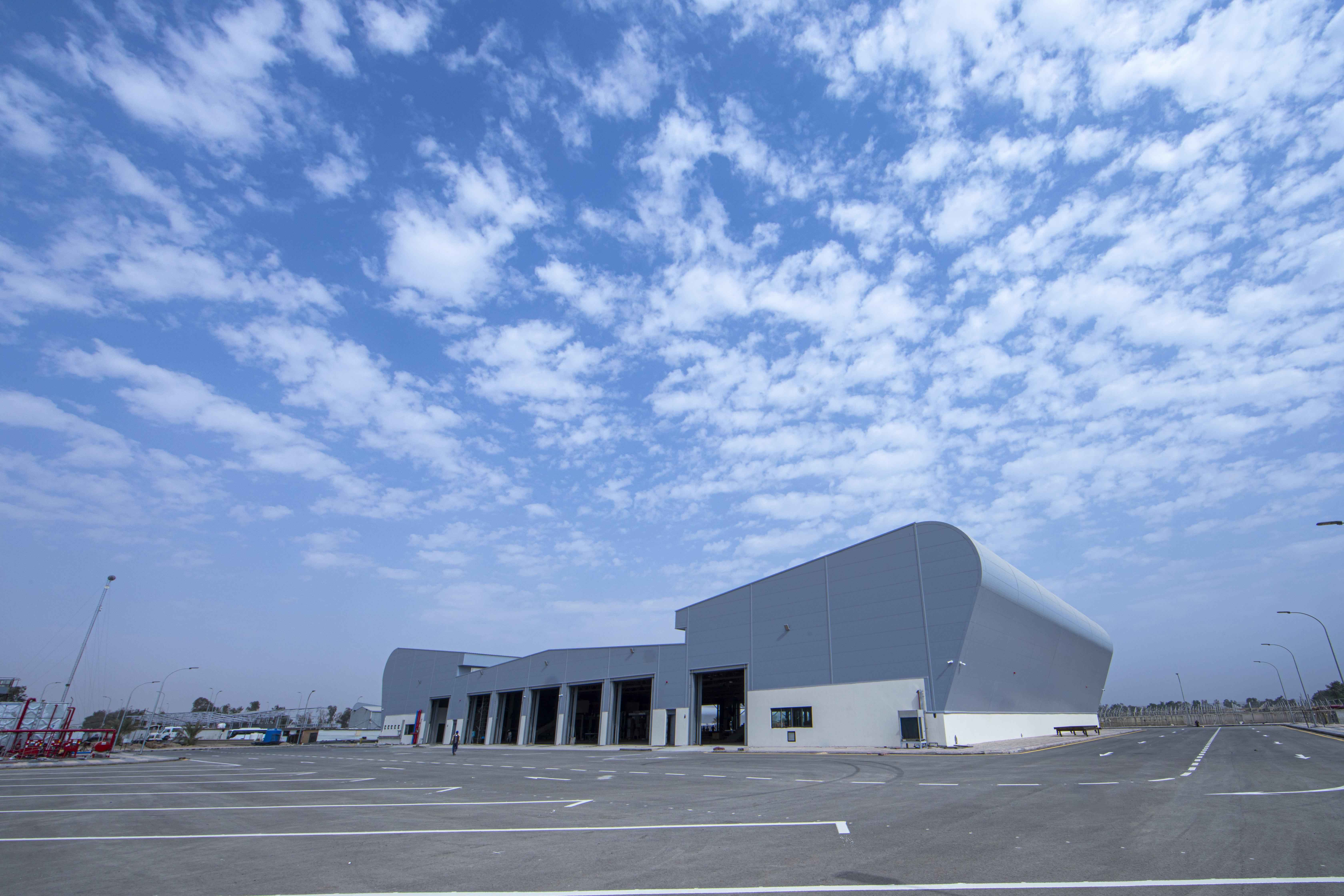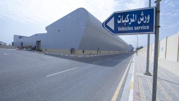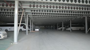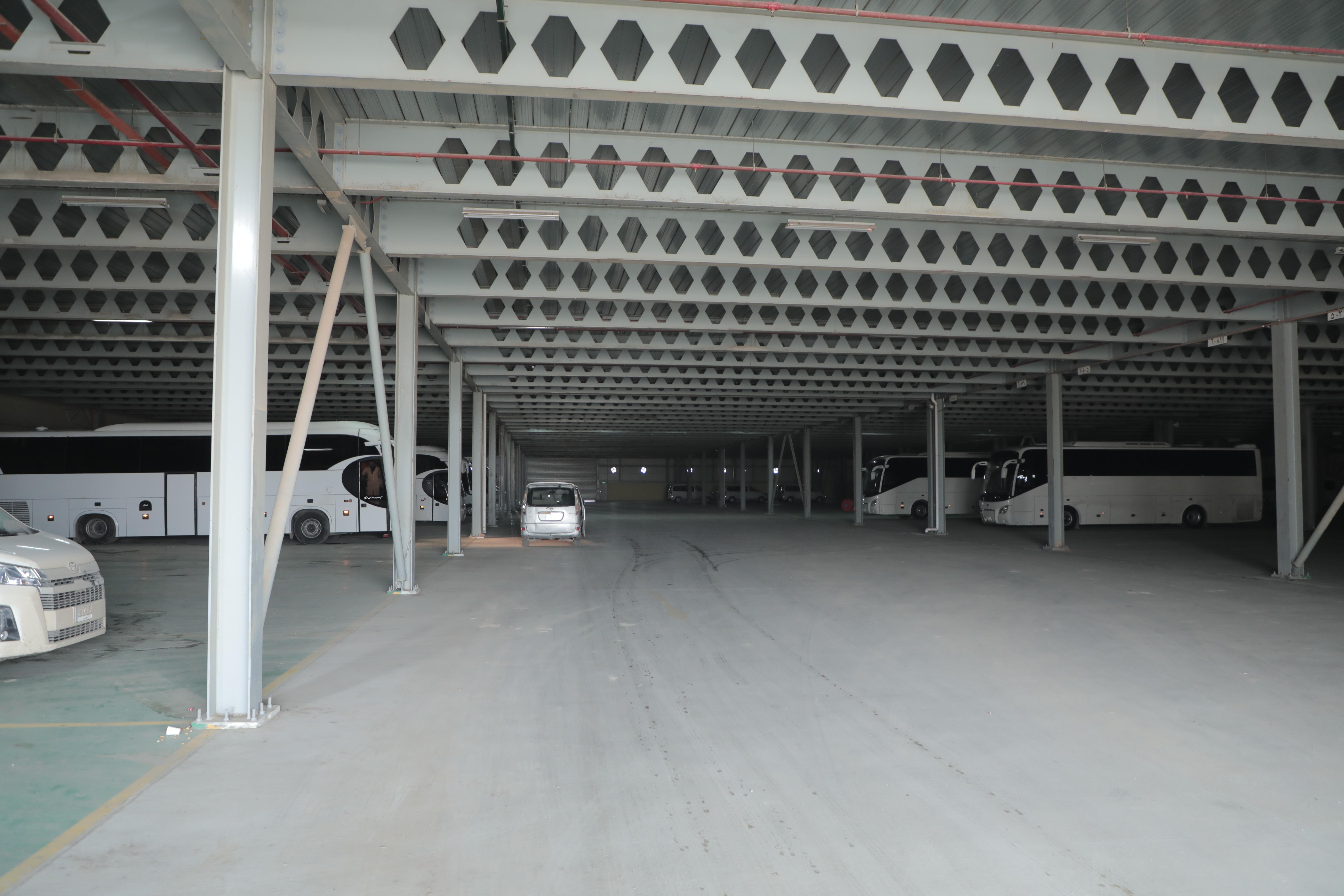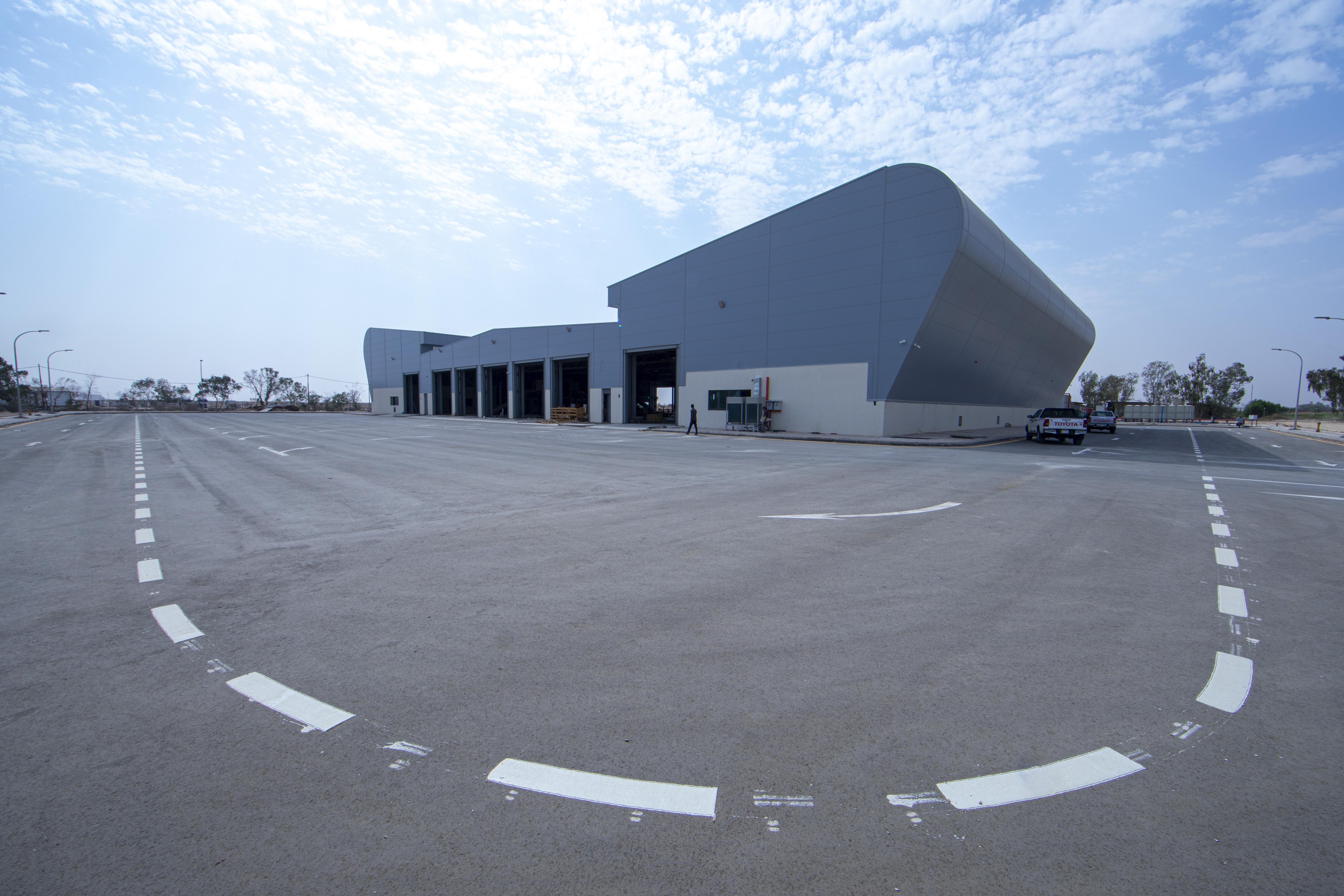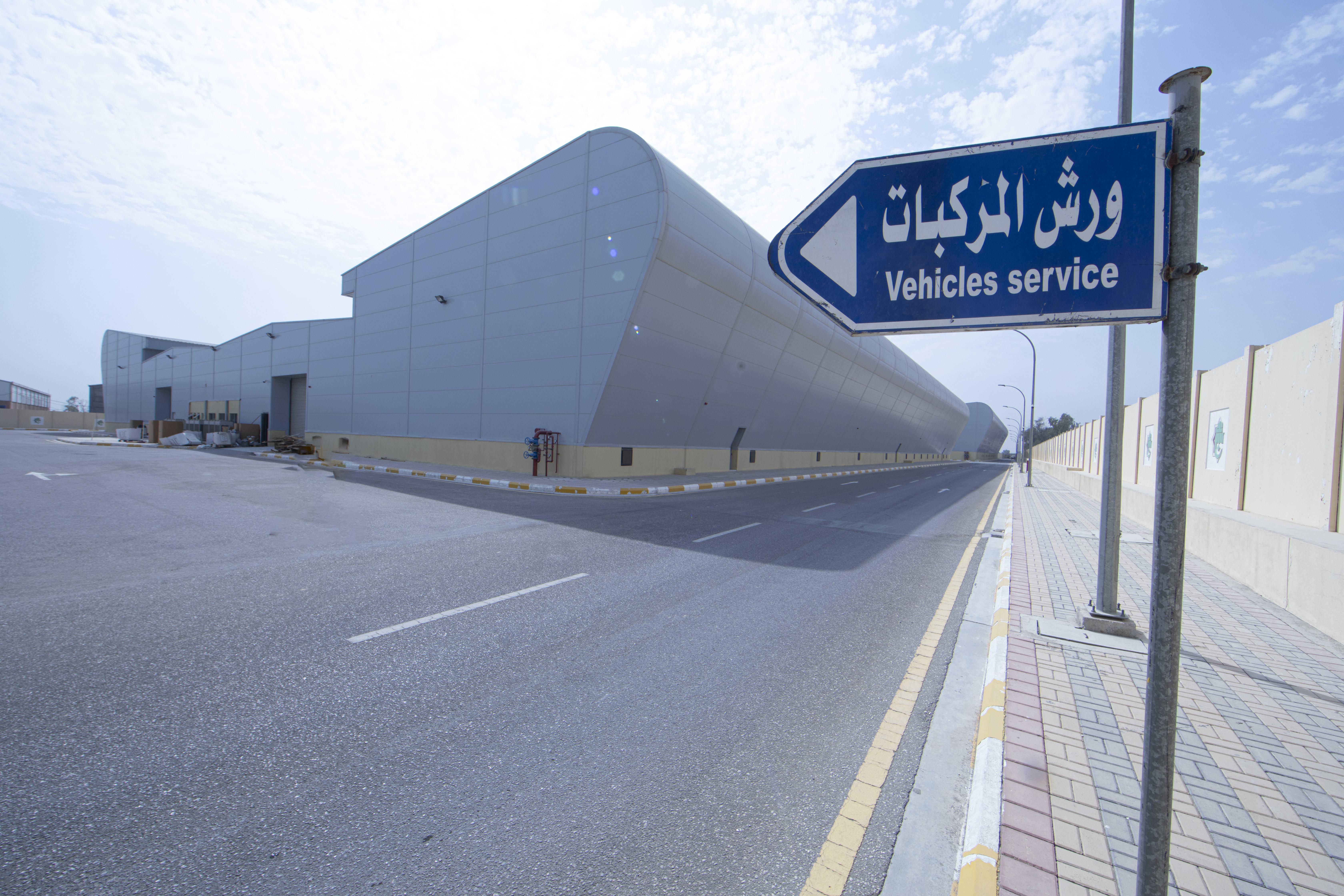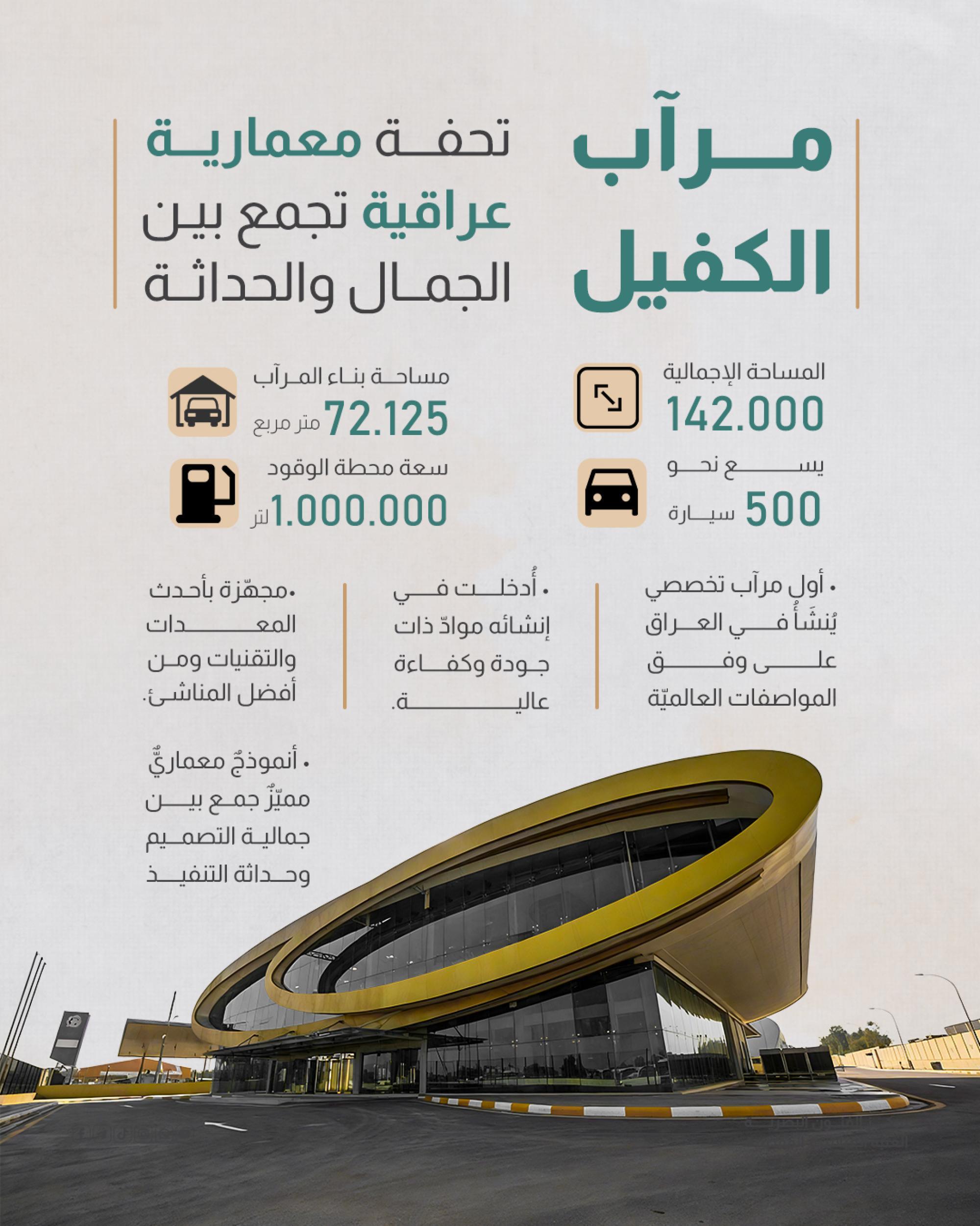 أُقيم المرآب على مساحة تبلغ (72.125) م2 وبمساحة بناء (142,000) م2، وقد قُسّم لخمسة مقاطع : 1- مخصّص للإدارة المركزيّة ويقوم بتدوين وأرشفة جميع المعلومات الفنّية لأيّ عجلةٍ تدخل المرآب . 2- محطّة لتزويد السيّارات بالوقود بنوعَيْه (البنزين – الكاز أويل)، إذ تبلغ السعة الإجماليّة الخاصّة بها (1.000.000) لتر وهذا القسم مزوّد بتقنياتٍ حديثة. 3- مجمّع خاص بصيانة العجلات الخفيفة. 4- مجموعة ورشٍ متكاملة لصيانة وإدامة العجلات الثقيلة. 5- موقفٌ للسيّارات بكلّ أنواعها سواءً العجات الكبيرة أو الصغيرة، حيث يتكوّن هذا الجزء من طابقَيْن كبيرَيْن روعي فيهما تقسيم الأماكن الخاصّة بخزن كلّ نوعٍ من السيّارات وبسعة نحو (500) سيارة تقريباً بجميع أنواعها.