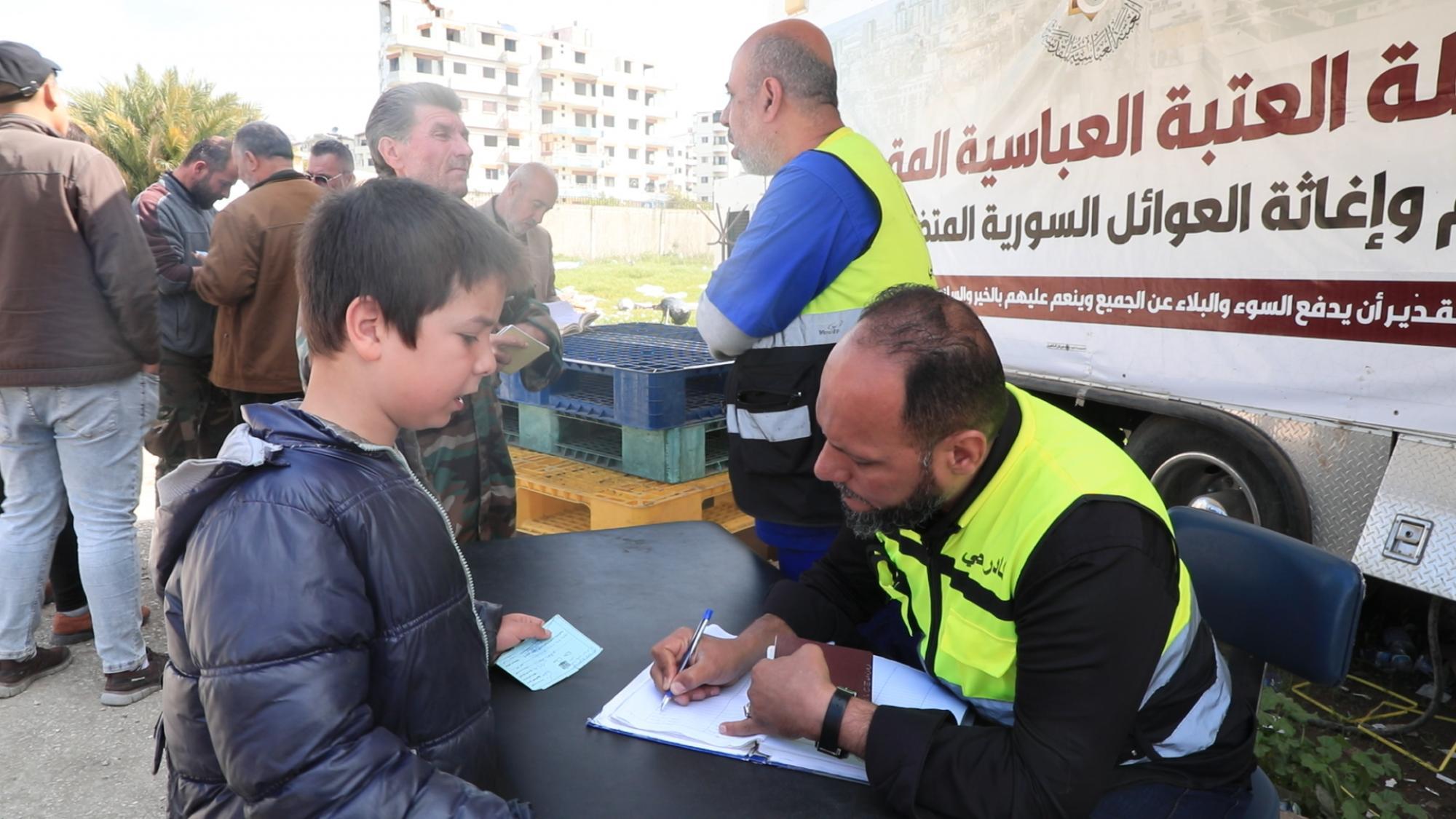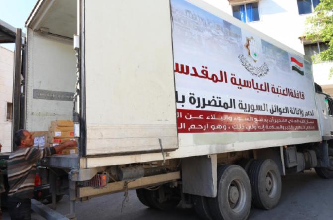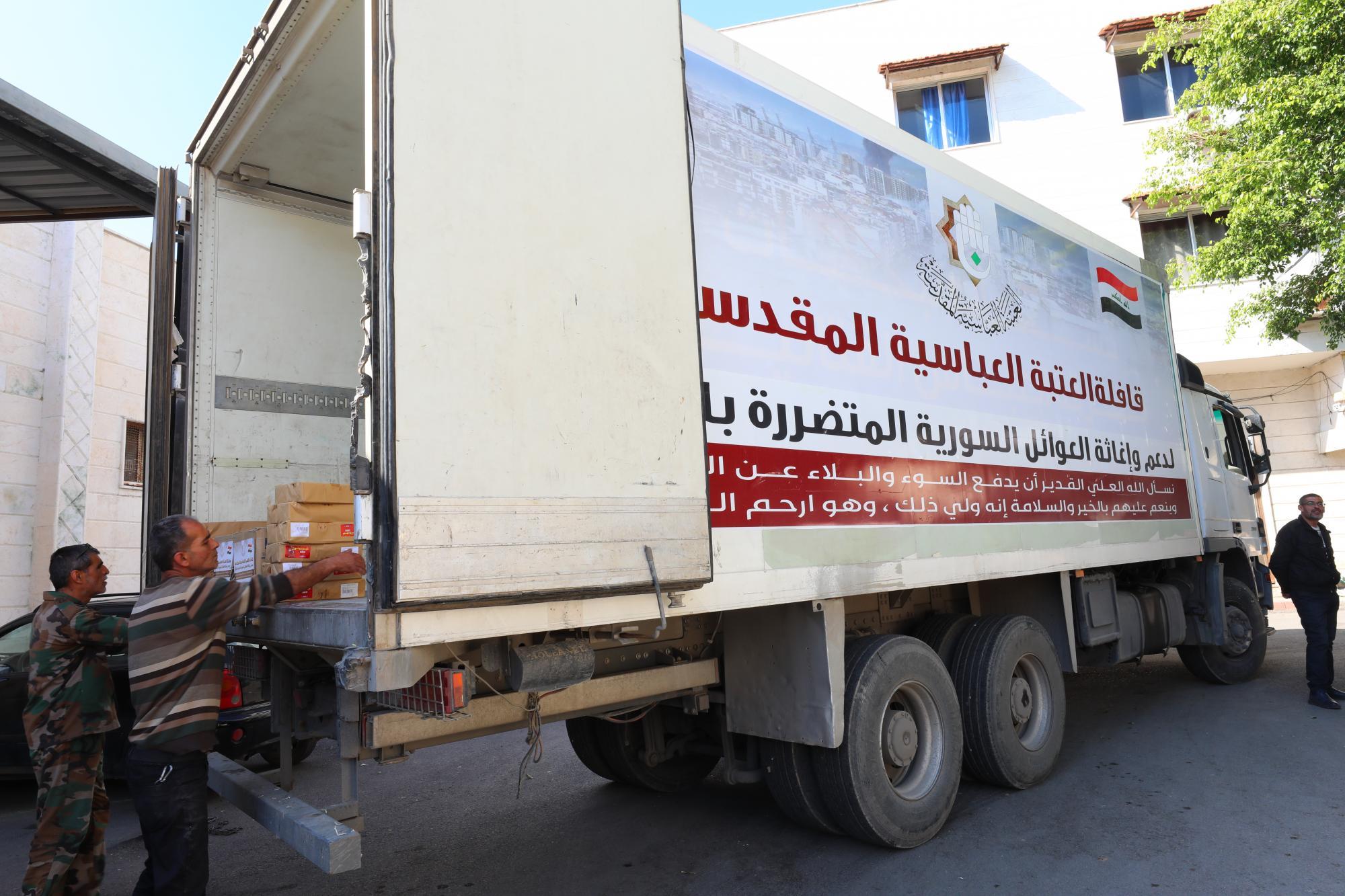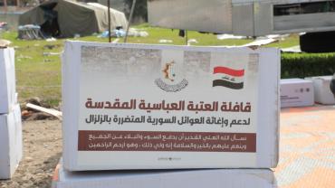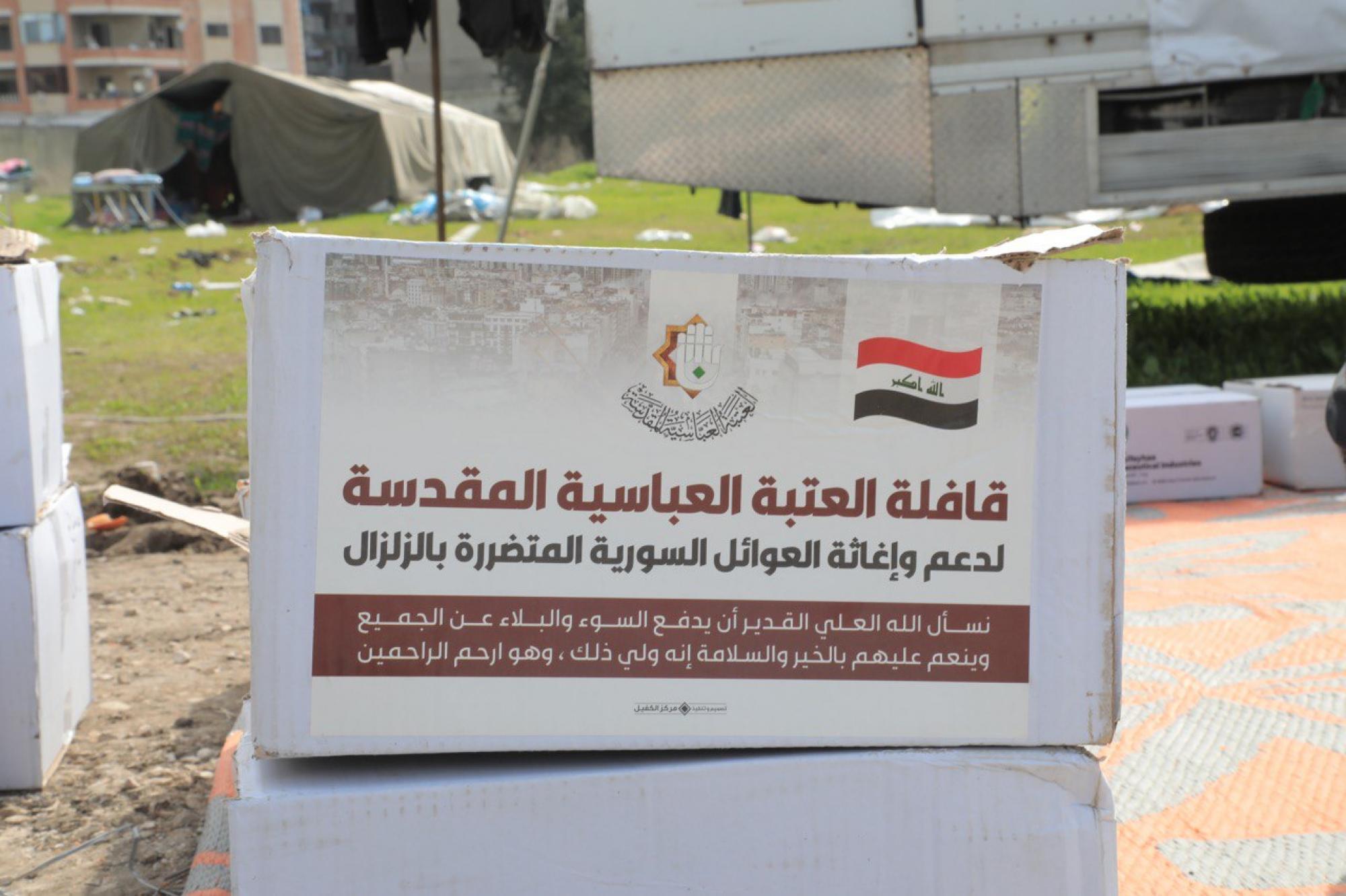 إغاثة متضرري زلزال سوريا: في شباط 2023، شهدت سوريا زلزالًا مدمرًا أودى بحياة الآلاف وترك العديد من العائلات بلا مأوى، وعلى إثر ذلك نشر مكتب المرجع الديني الأعلى السيد علي السيستاني بيانًا دعا فيه، إلى تضافر جهود الجهات المعنية وعامة أهل الخير في سبيل توفير الاحتياجات الضرورية للمتضررين في أسرع وقت، واستجابت لذلك أرسلت العتبة العباسية المقدسة قافلة إغاثية ضخمة ضمت أكثر من 1555 طنًّا من المواد الدوائية والغذائية والمستلزمات الأساسية، ولم تقتصر المساعدات على المواد الغذائية فقط، بل شملت أيضًا إنشاء مخيمات لإيواء المتضررين وتوفير الرعاية الصحية اللازمة لهم، واستمرت جهود العتبة المقدسة في دعم المتضررين لأشهر، مما أسهم في تخفيف معاناتهم وإعادة بناء حياتهم.