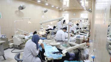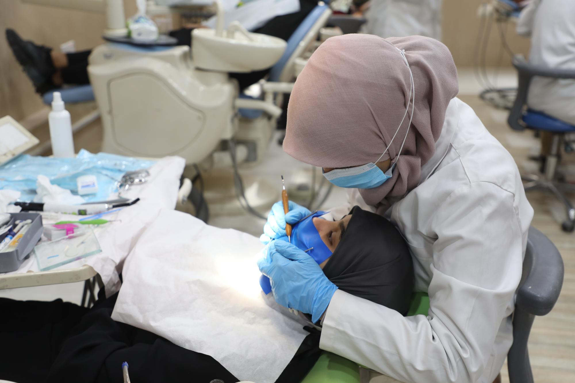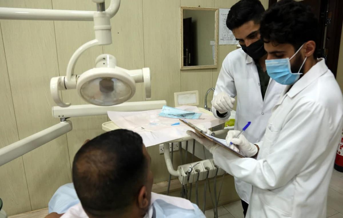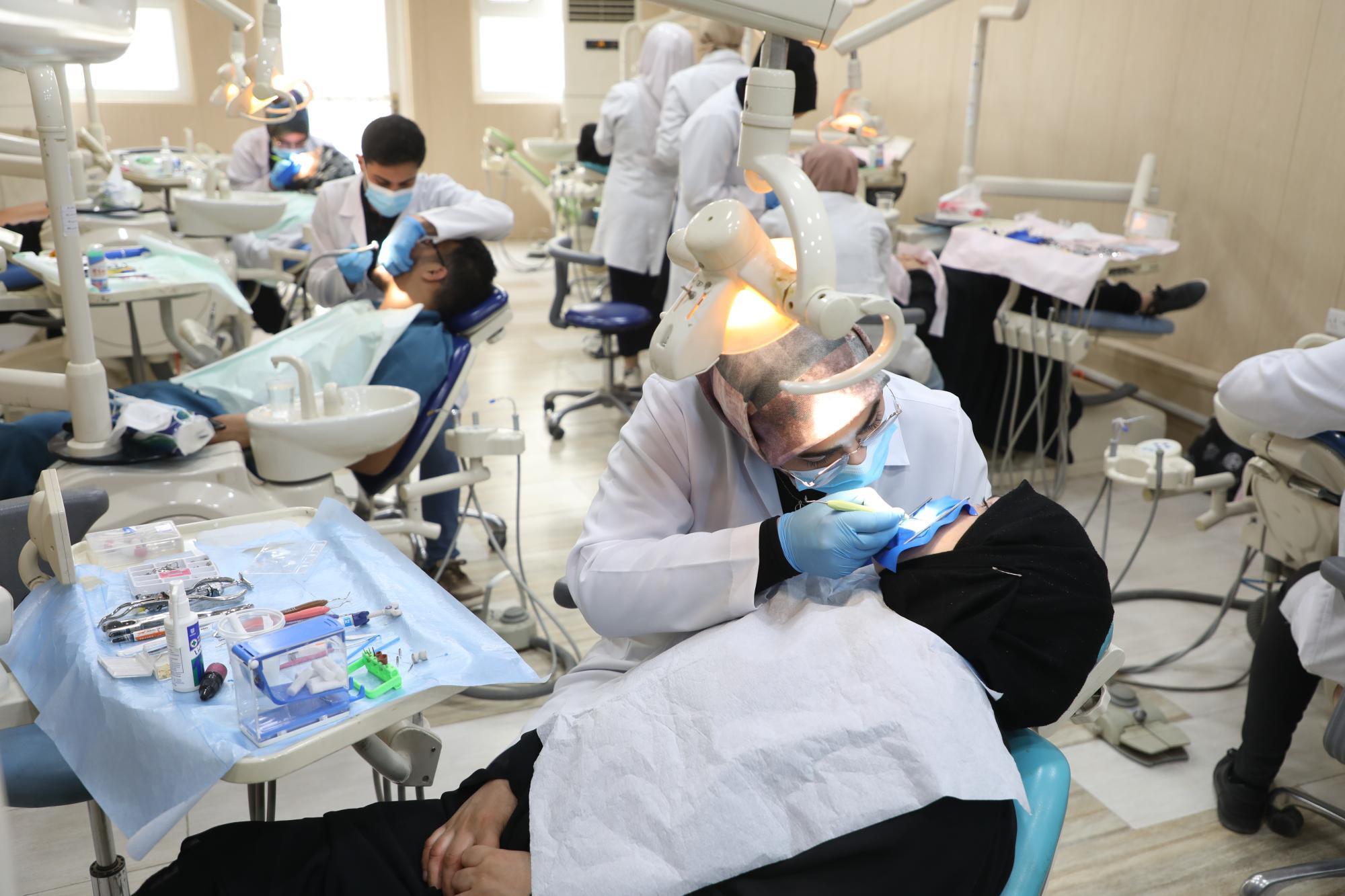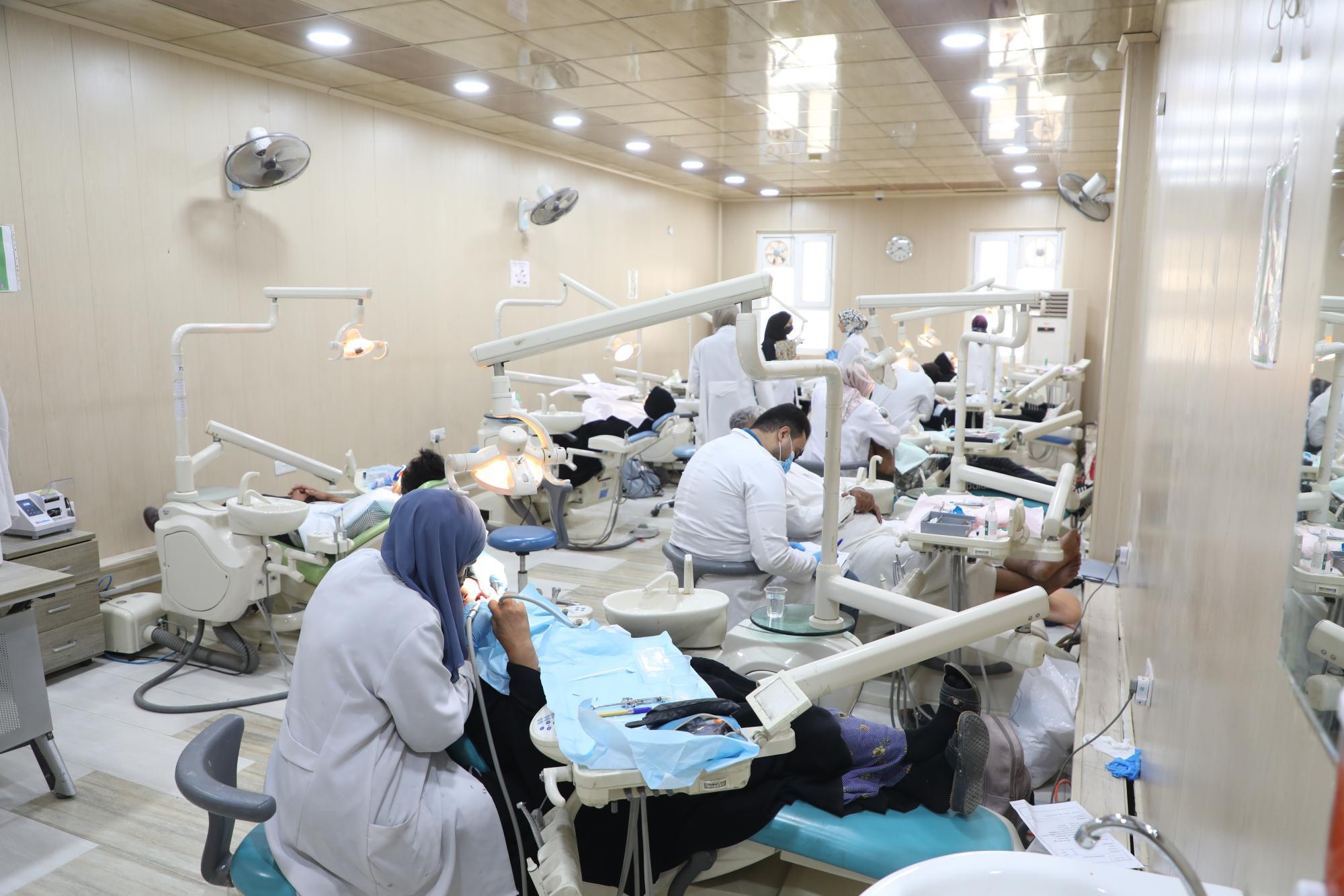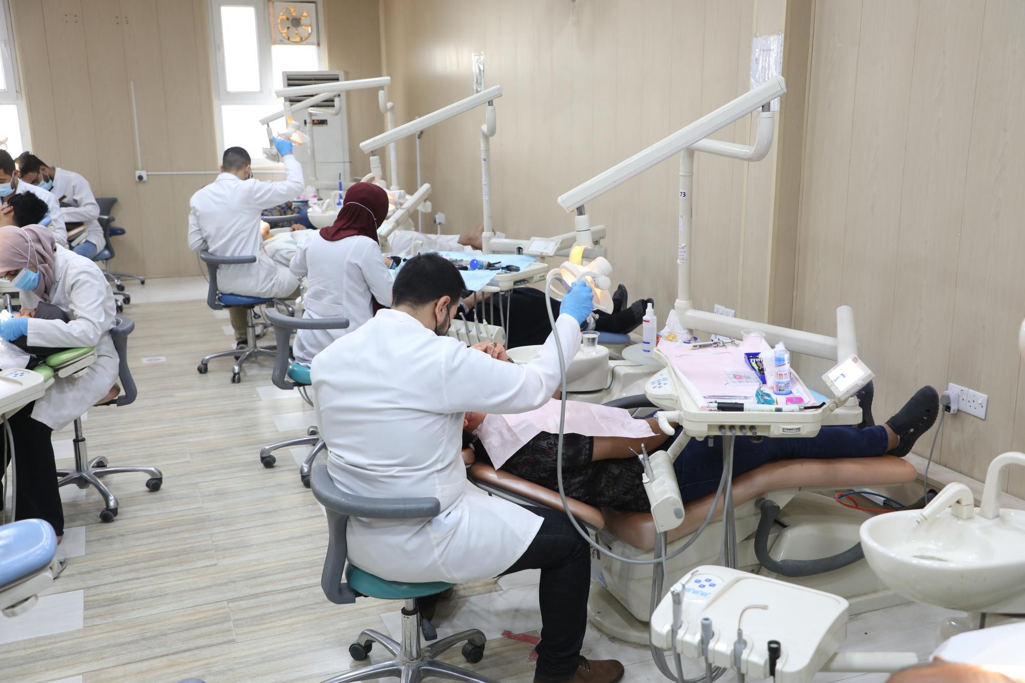 يتوزع دوام العيادات حسب الجدول الذي تقره العمادة ويكون الدوام يومياً ومقسم للمرحلتين الرابعة الخامسة: يدخل المراجع للعيادات وحيث يتم استقباله وفحصه بشكل أول من قبل الطلاب وإعطاءه الموعد المناسب للعيادة التي يحتاجها وحسب وقت الطلاب، حيث يوجد غرفة للفحص الأولي للمعاينة المبدئية واخذ التشخيص الاولي، وتتوزع العيادات على المواد الدراسية التالية: - المرحلة الرابعة: عيادة الجراحة، عيادة المعالجة، عيادة أمراض اللثة، عيادة صناعة الأسنان. - المرحلة الخامسة: عيادة الجراحة، عيادة المعالجة، عيادة أمراض اللثة، عيادة صناعة الأسنان، عيادة تقويم الأسنان، عيادة طب أسنان الأطفال، عيادة وقاية الأسنان، عيادة طب الفم. بعد تشخيص أي مريض واحتياجه للعلاج المناسب يتم أخذ المعلومات الكاملة لكل مريض في كل عيادة على ملف خاص به (الطبلة) ويتم تسجيل كافة مراحل العمل مع موافقة الأساتذة والمشرفين وتواقيعهم عليه، ويسلم للمعيد المختص بنهاية اليوم لتثبيته في سجل أعمال الطالب.