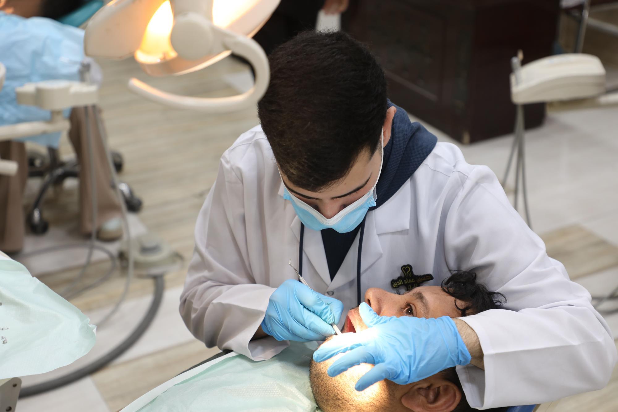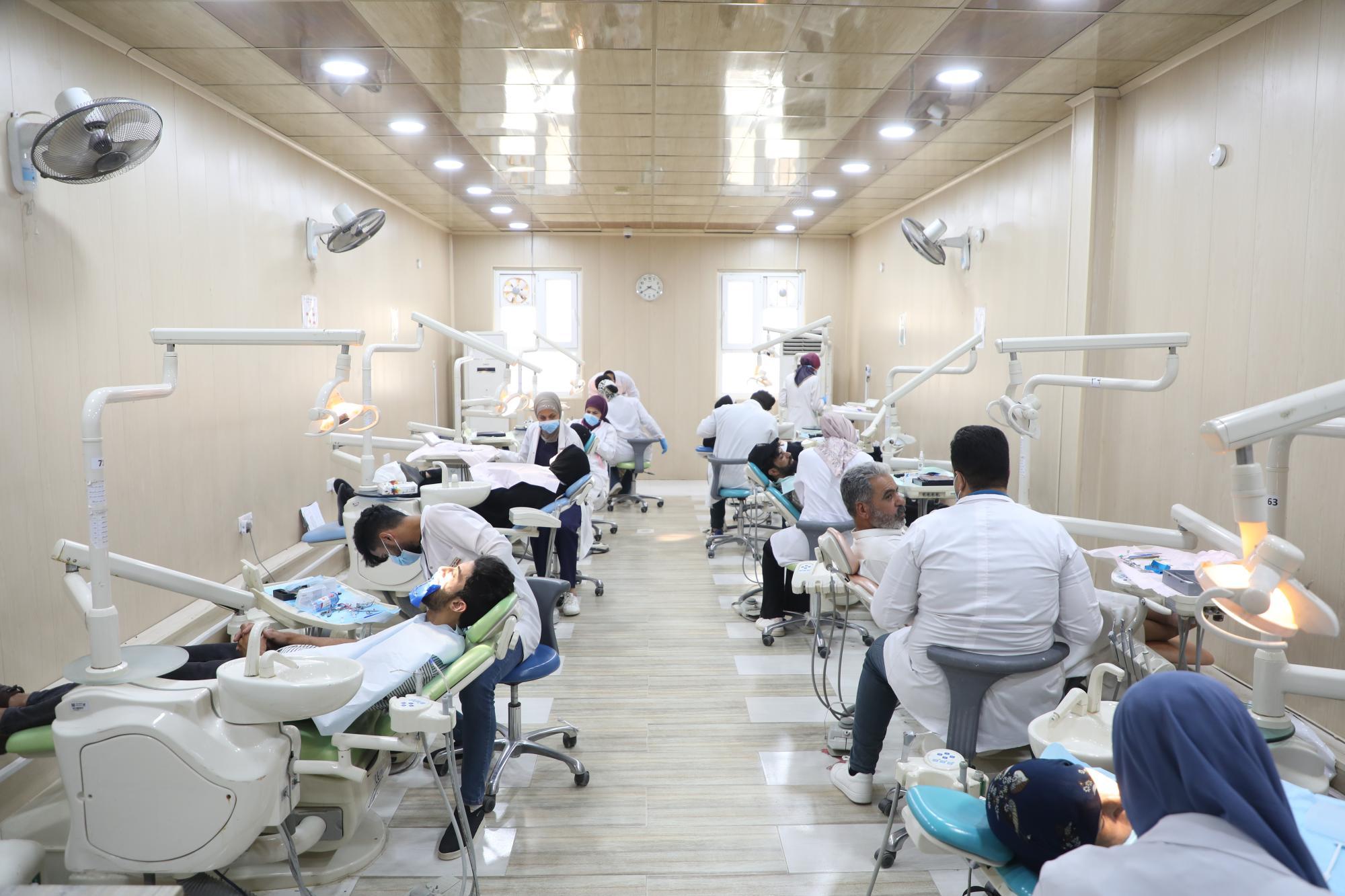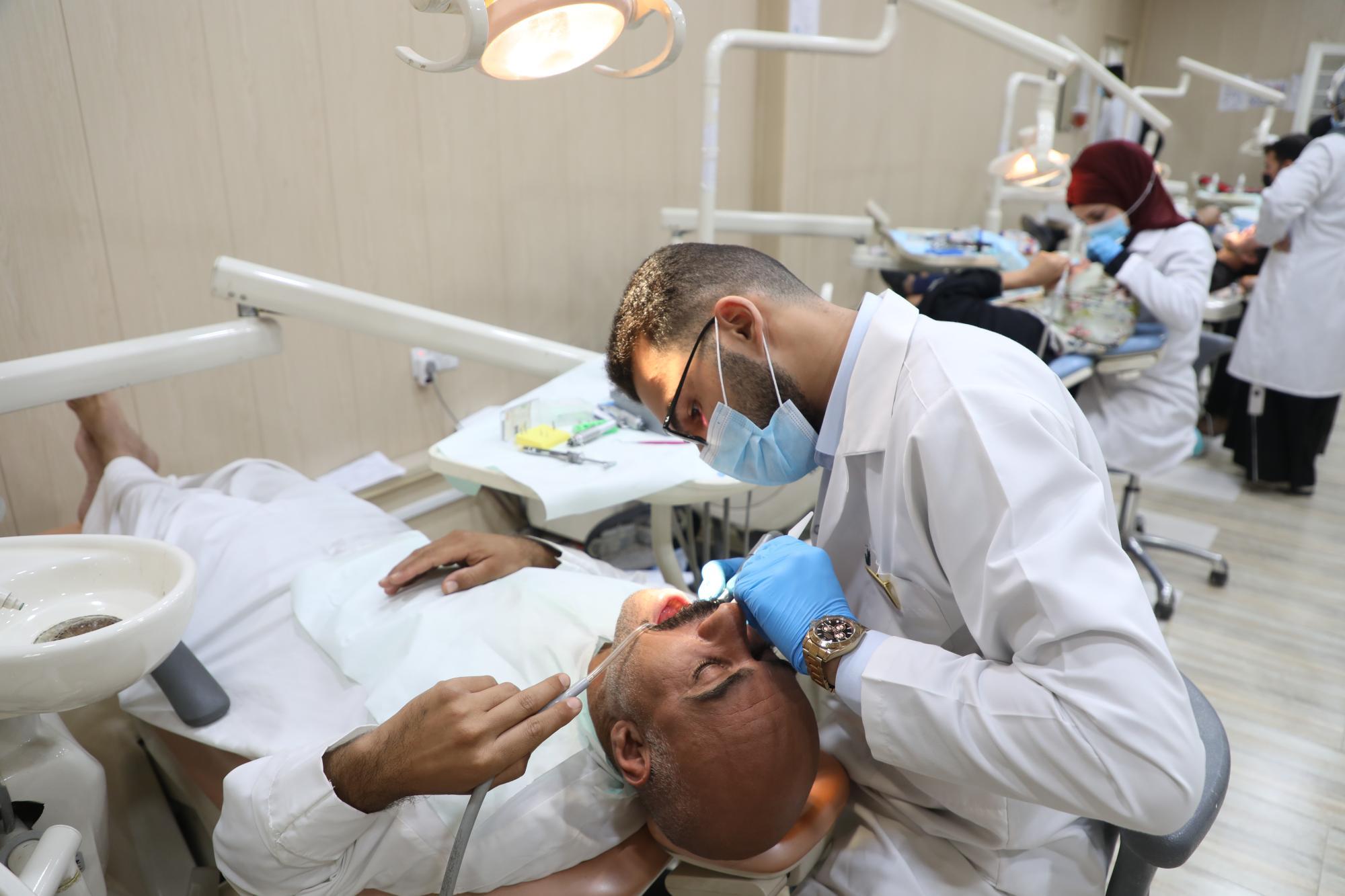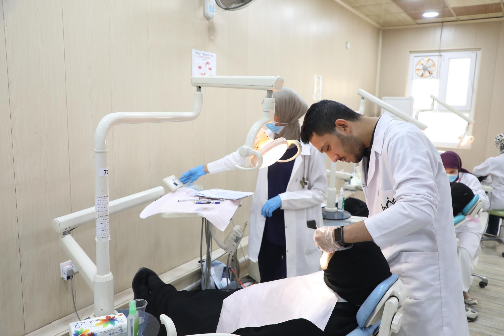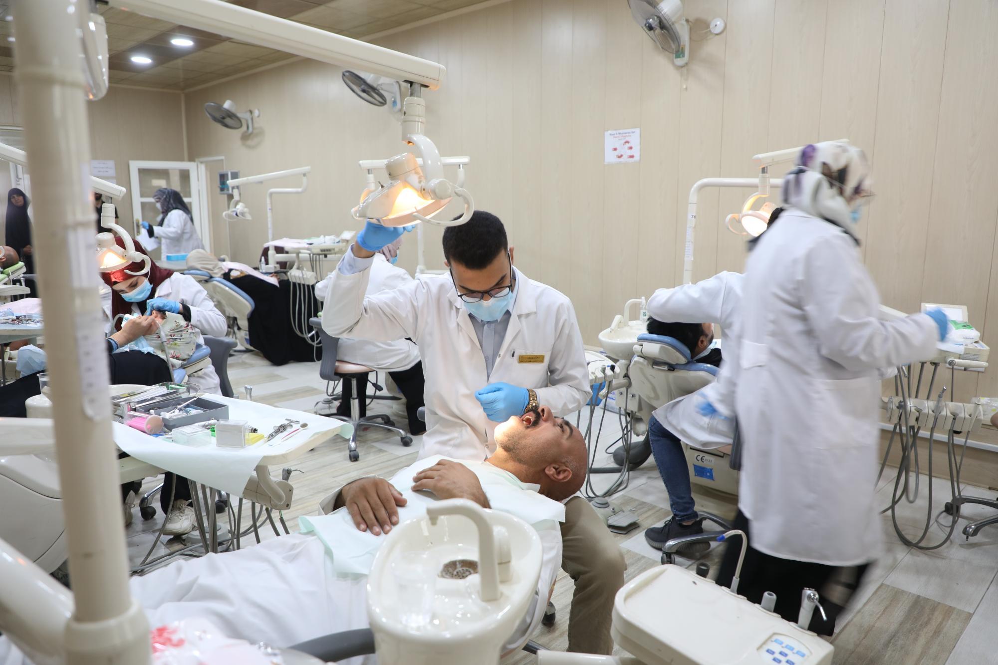 يتوزع دوام العيادات حسب الجدول الذي تقره العمادة ويكون الدوام يومياً ومقسم للمرحلتين الرابعة الخامسة: يدخل المراجع للعيادات وحيث يتم استقباله وفحصه بشكل أول من قبل الطلاب وإعطاءه الموعد المناسب للعيادة التي يحتاجها وحسب وقت الطلاب، حيث يوجد غرفة للفحص الأولي للمعاينة المبدئية واخذ التشخيص الاولي، وتتوزع العيادات على المواد الدراسية التالية: - المرحلة الرابعة: عيادة الجراحة، عيادة المعالجة، عيادة أمراض اللثة، عيادة صناعة الأسنان. - المرحلة الخامسة: عيادة الجراحة، عيادة المعالجة، عيادة أمراض اللثة، عيادة صناعة الأسنان، عيادة تقويم الأسنان، عيادة طب أسنان الأطفال، عيادة وقاية الأسنان، عيادة طب الفم. بعد تشخيص أي مريض واحتياجه للعلاج المناسب يتم أخذ المعلومات الكاملة لكل مريض في كل عيادة على ملف خاص به (الطبلة) ويتم تسجيل كافة مراحل العمل مع موافقة الأساتذة والمشرفين وتواقيعهم عليه، ويسلم للمعيد المختص بنهاية اليوم لتثبيته في سجل أعمال الطالب.