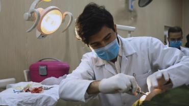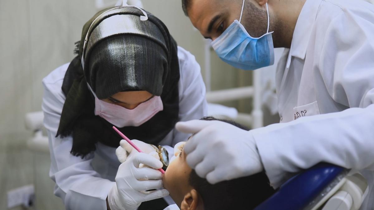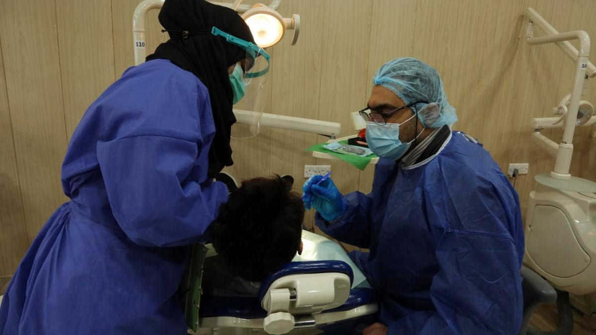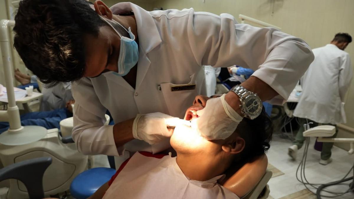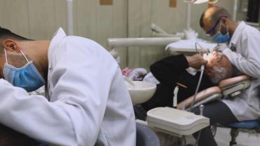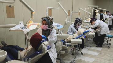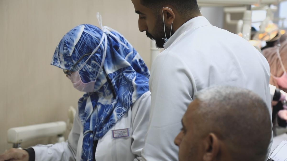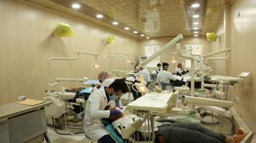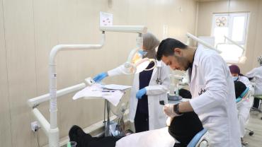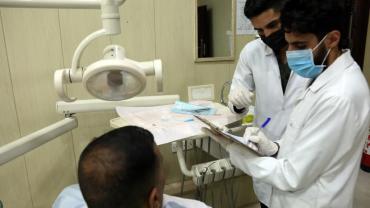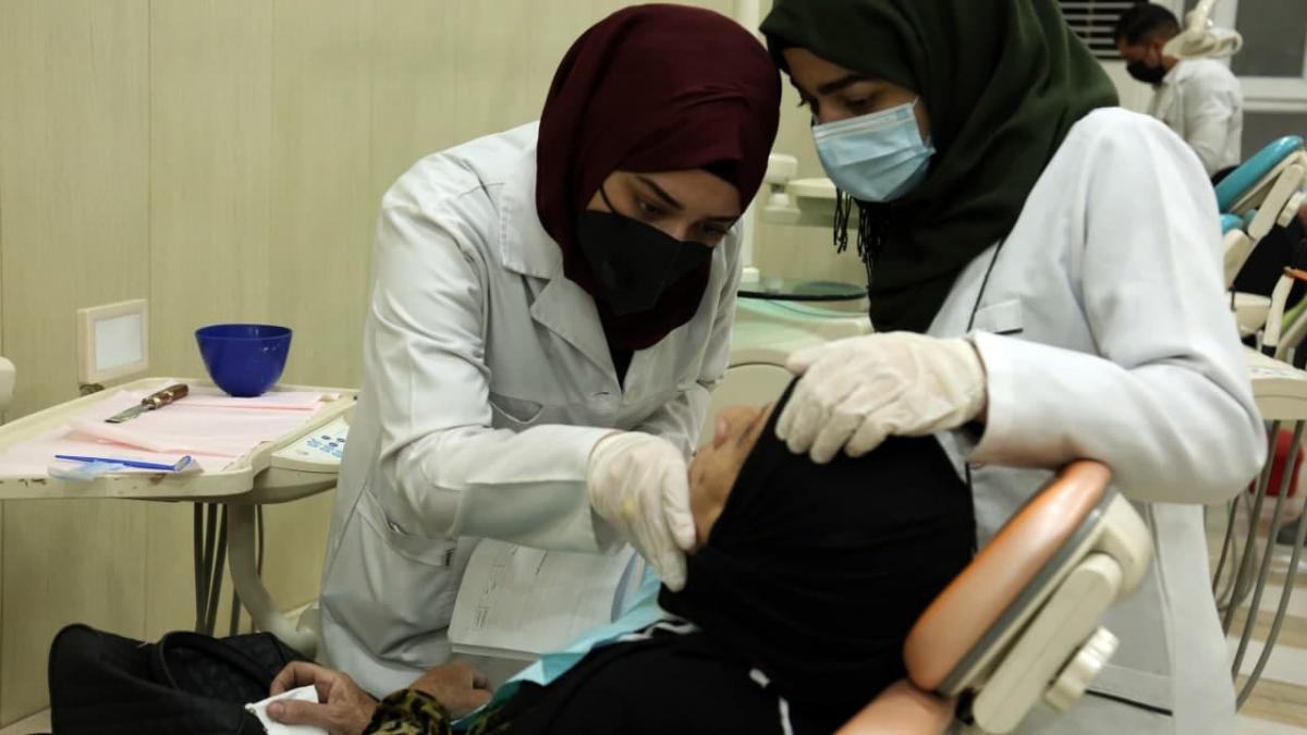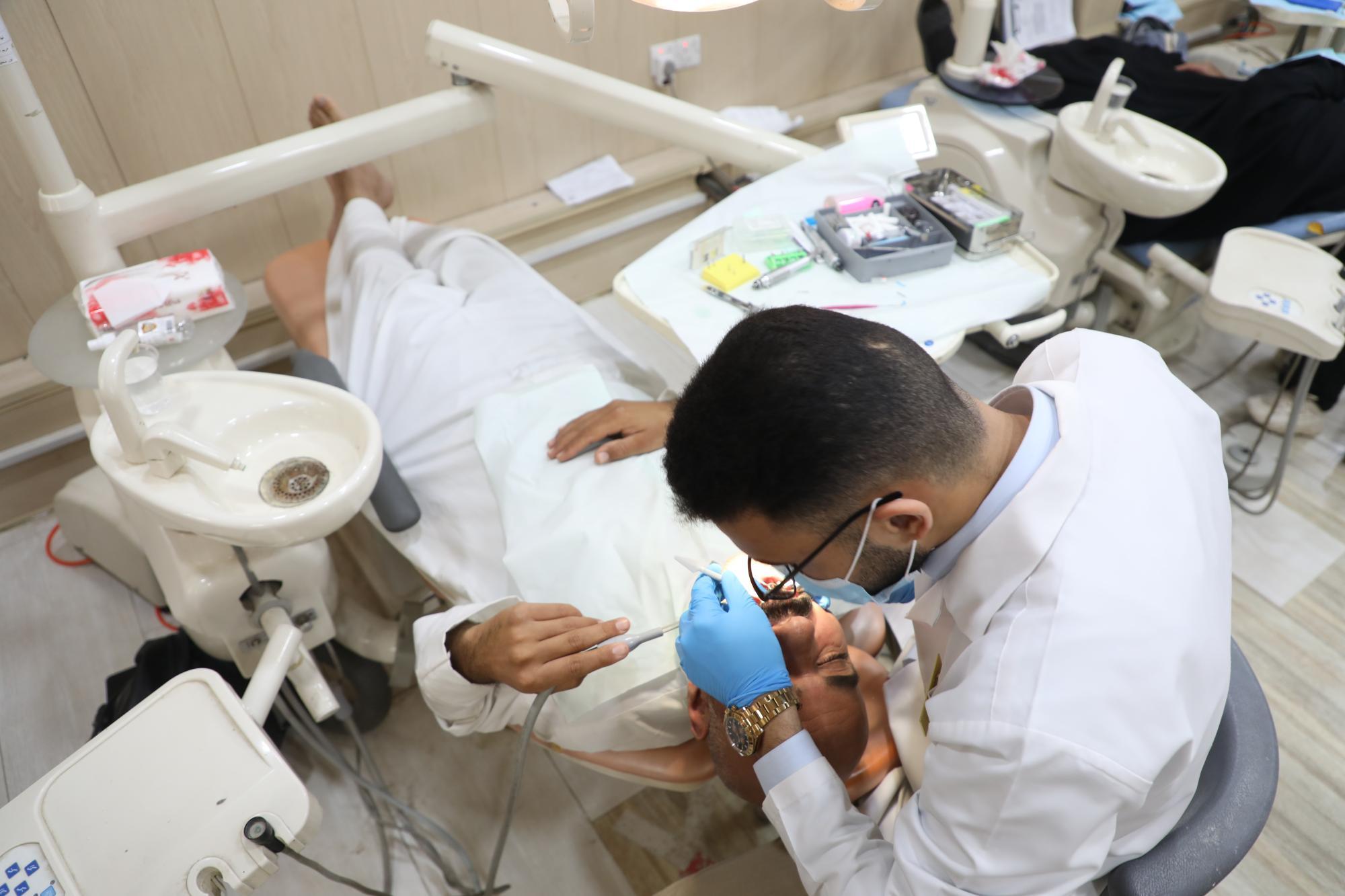 يتوزع دوام العيادات حسب الجدول الذي تقره العمادة ويكون الدوام يومياً ومقسم للمرحلتين الرابعة الخامسة: يدخل المراجع للعيادات وحيث يتم استقباله وفحصه بشكل أول من قبل الطلاب وإعطاءه الموعد المناسب للعيادة التي يحتاجها وحسب وقت الطلاب، حيث يوجد غرفة للفحص الأولي للمعاينة المبدئية واخذ التشخيص الاولي، وتتوزع العيادات على المواد الدراسية التالية: - المرحلة الرابعة: عيادة الجراحة، عيادة المعالجة، عيادة أمراض اللثة، عيادة صناعة الأسنان. - المرحلة الخامسة: عيادة الجراحة، عيادة المعالجة، عيادة أمراض اللثة، عيادة صناعة الأسنان، عيادة تقويم الأسنان، عيادة طب أسنان الأطفال، عيادة وقاية الأسنان، عيادة طب الفم. بعد تشخيص أي مريض واحتياجه للعلاج المناسب يتم أخذ المعلومات الكاملة لكل مريض في كل عيادة على ملف خاص به (الطبلة) ويتم تسجيل كافة مراحل العمل مع موافقة الأساتذة والمشرفين وتواقيعهم عليه، ويسلم للمعيد المختص بنهاية اليوم لتثبيته في سجل أعمال الطالب.