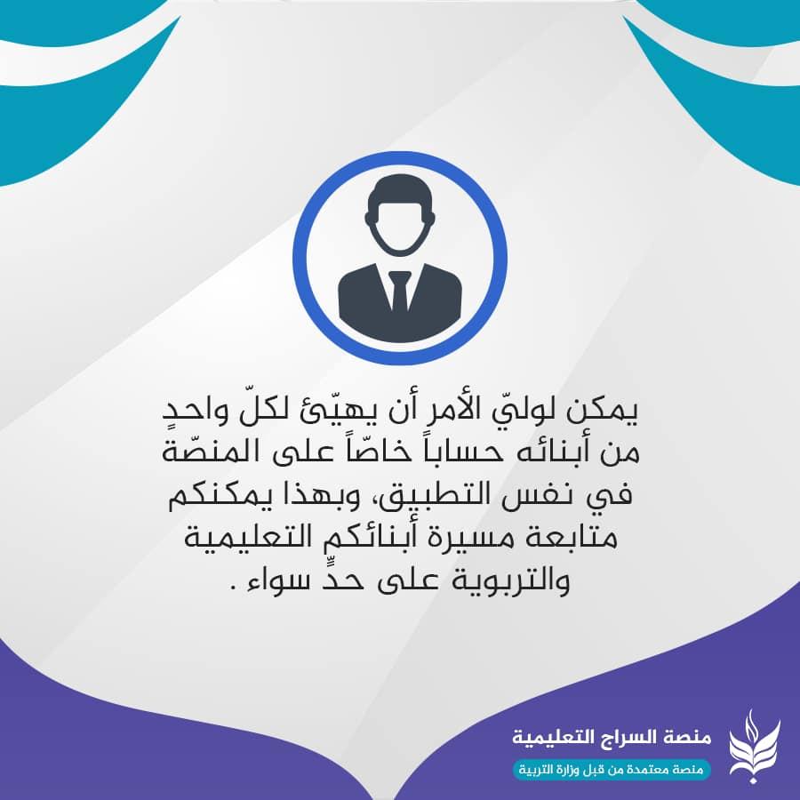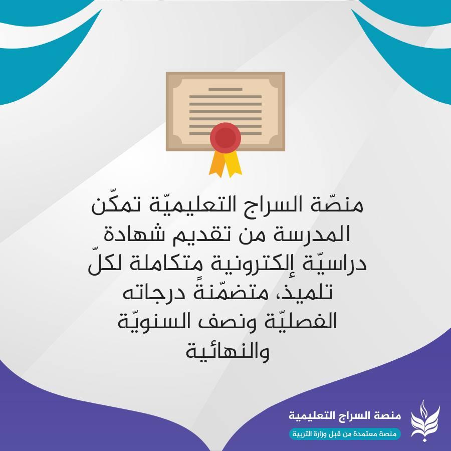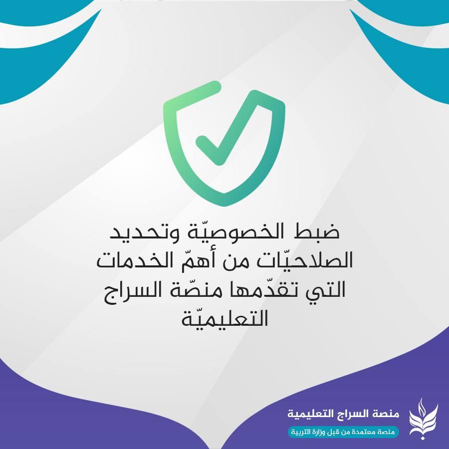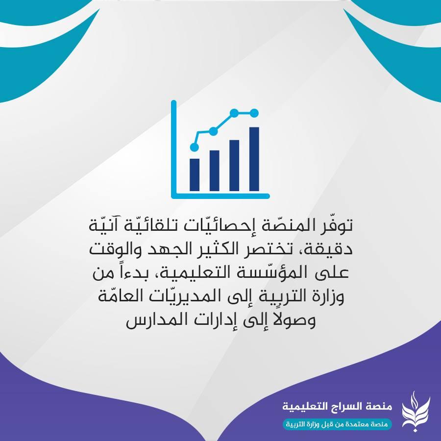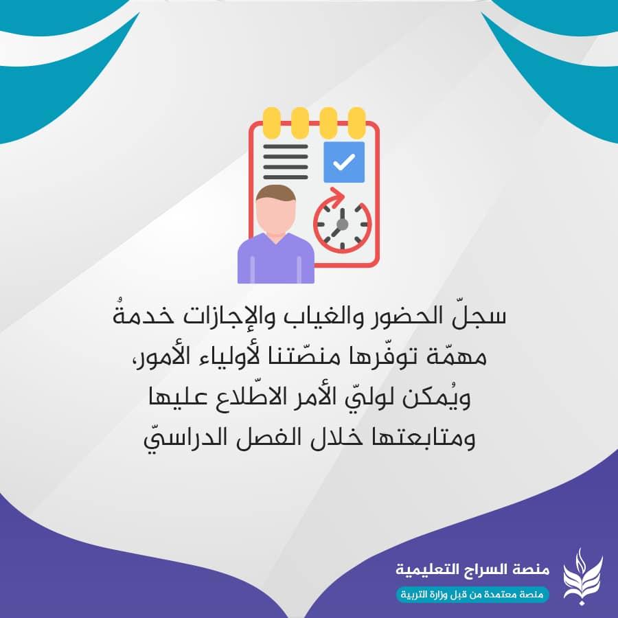 تطبيق متكامل للأستاذ: يسهّل عليه عمليّة إرسال الدروس والواجبات والامتحانات، وسجلّ الدرجات والحضور والغياب مع خدماتٍ متنوّعة أخَر. تطبيق متكامل للتلميذ: ووليّ أمره، لمتابعة الدروس والمحاضرات والامتحانات والواجبات المدرسية وغيرها من البيانات. تتبّع غيابات وإجازات التلاميذ بصورةٍ آنيّة: يُمكن لوليّ الأمر الاطّلاع على سجلّ الحضور والغياب والإجازات ومتابعتها خلال الفصل الدراسيّ لكلّ تلميذ من أبنائه المسجّلين في المنصّة. مكتبة التلفزيون التربويّ: مكتبةً تربويّة شاملة مؤرشفة بنظامٍ سهلٍ، وتحتوي على جميع الموادّ الدراسية الفيديوية التي يصوّرها أساتذة التلفزيون التربوي المُعتَمَدين من قِبل وزارة التربية. واجبات إلكترونية تحدّد وفق توقيتاتٍ زمنيّة محدّدة: منصّة السراج تمكّن الأستاذ من تهيئة الواجب المدرسيّ وتسليمه للتلاميذ خلال زمنٍ محدّد يتقيّد به التلميذ، ومن ثمّ استلام الإجابات من التلاميذ وتقييمها، وإرسال الدرجات لكلّ تلميذ مع وليّ أمره للاطّلاع عليها. نظام محادثةٍ داخليّ آمن