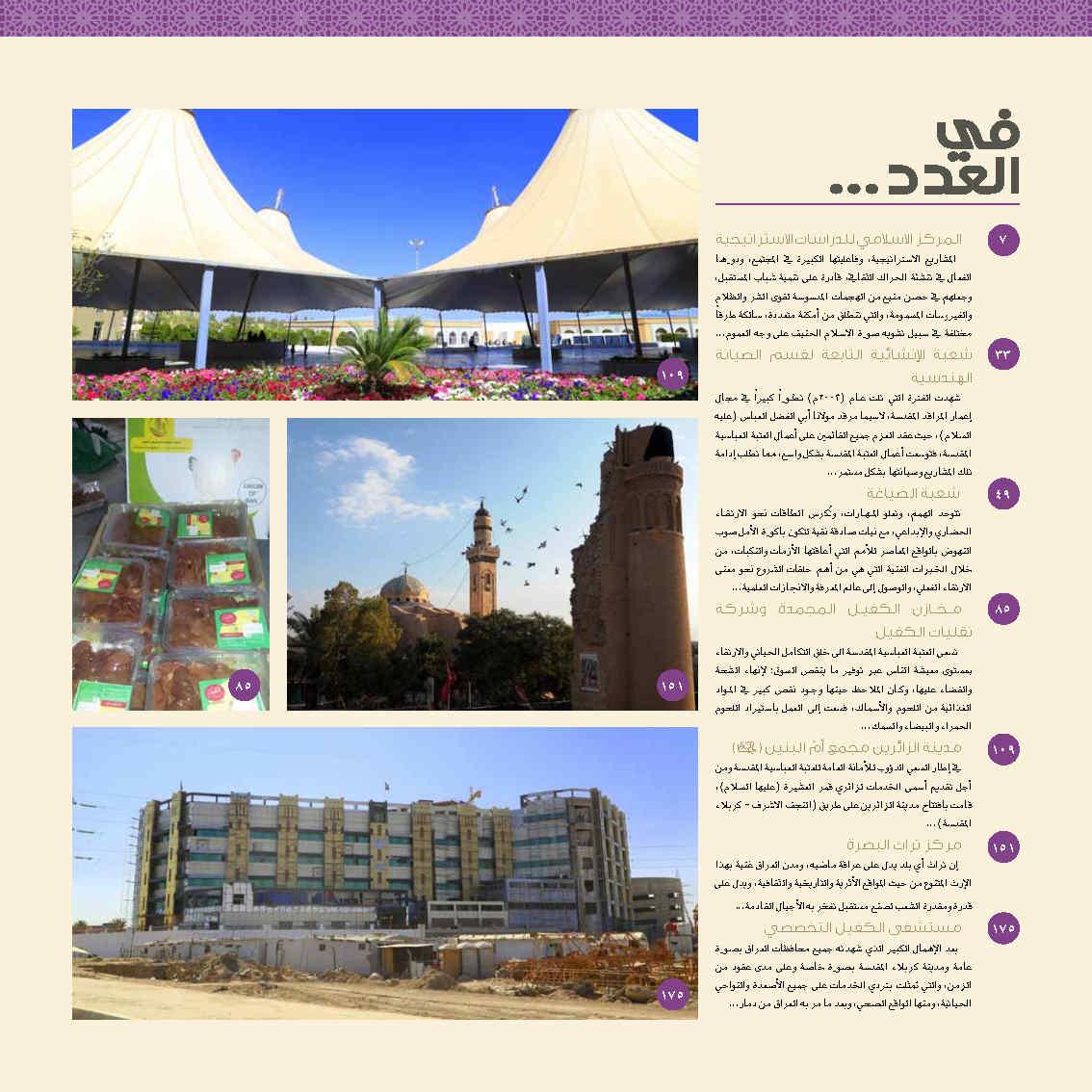 مواصفات المجلة • الفئة المستهدفة : تناسب مختلف الشرائح العمرية مع التركيز على الشباب والمثقفين. • الإصدار : تصدر بشكل دوري (شهري أو فصلي) لضمان التفاعل المستمر مع القضايا المجتمعية. • التصميم والإخراج : مطبوعة بأعلى معايير الجودة، وتستخدم تصاميم حديثة لجذب القارئ. • اللغة والأسلوب : تعتمد لغة بسيطة وسلسة تناسب الجميع، مع عمق فكري يناسب الباحثين. أهمية المجلة • منبر ثقافي : تساهم في إثراء الفكر الإسلامي والثقافة العامة. • تعزيز الهوية الإسلامية : بتسليط الضوء على التعاليم الدينية والقيم الأخلاقية. • دعم الشباب : من خلال محتوى يركز على قضاياهم وتطلعاتهم. • التوثيق : أرشفة أنشطة العتبة العباسية ودورها في خدمة المجتمع. المواضيع التي تتناولها المجلة • الدين والفكر الإسلامي : مواضيع دينية تشرح القيم والتعاليم الإسلامية. • القضايا الاجتماعية : مناقشة مشكلات الشباب والأسرة والحلول الممكنة. • الثقافة العامة : مقالات عن التاريخ الإسلامي، العلوم، والفنون. • أخبار العتبة العباسية : تقارير عن المشاريع والأنشطة التي تقيمها العتبة. • التربية والتعليم : نصائح تربوية تهدف إلى بناء جيل مثقف وواعٍ.
