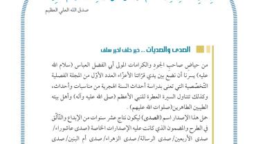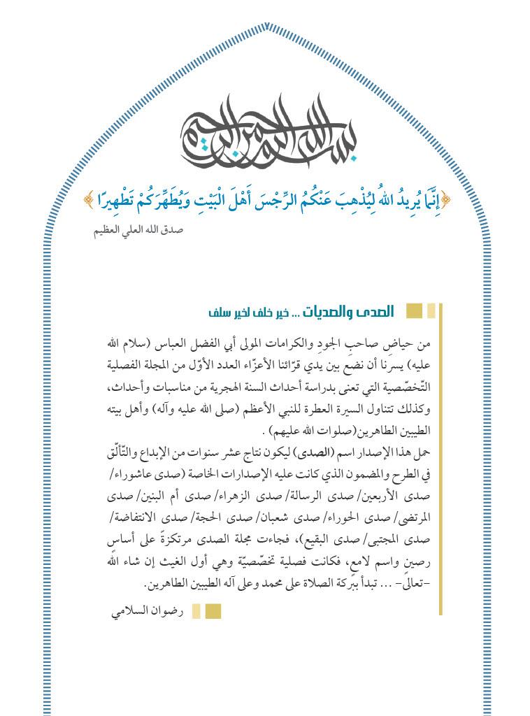 مجلة الصدى هي المجلة الفصلية الثقافية التابعة للعتبة العباسية المقدسة، والتي تعنى بدراسة وتوثيق الأحداث الدينية والثقافية الهامة في السنة الهجرية. تسعى المجلة إلى تقديم محتوى فكري وثقافي يعكس التزام العتبة العباسية المقدسة في نشر الوعي الديني والثقافي بين المجتمع، بما يعزز الفهم العميق للتاريخ الإسلامي وأحداثه الكبرى.