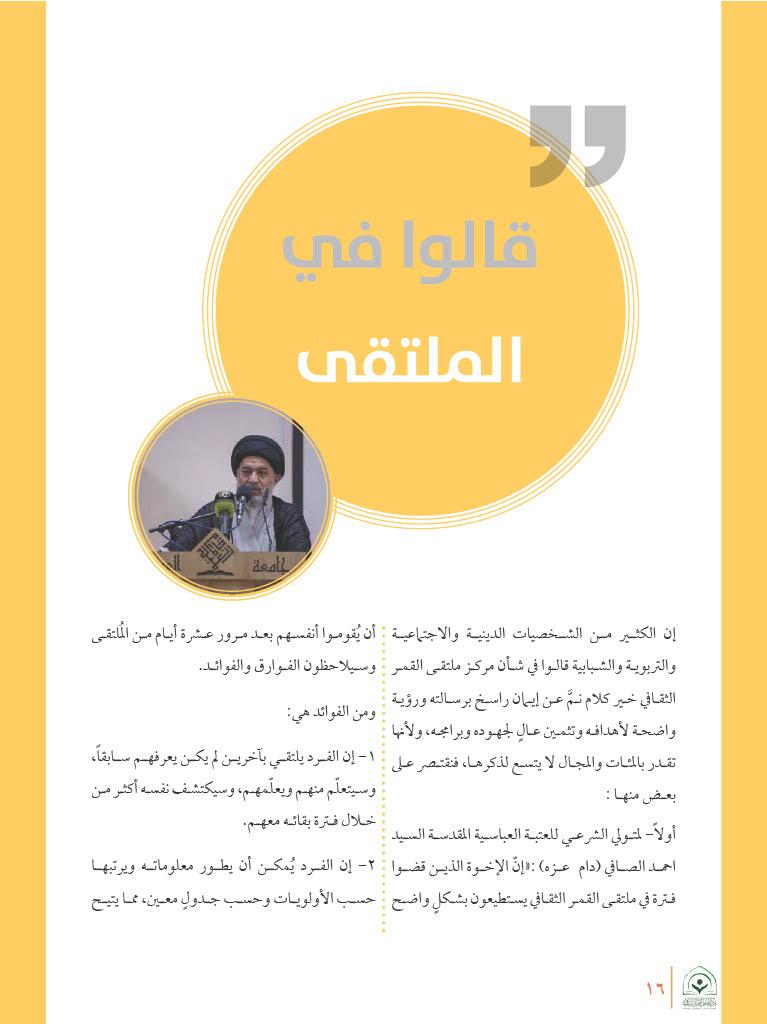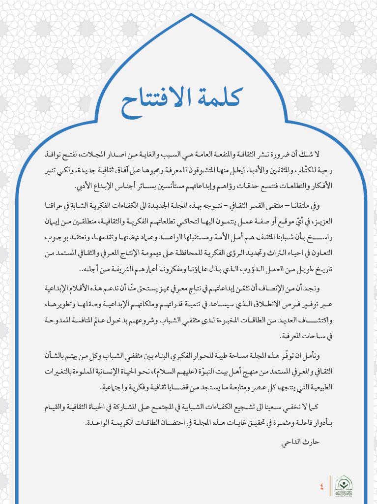 مجَلّةٌ فَصْلِيّةٌ ذَاتُ طَابِعٍ اجْتِمَاعِيٍّ، فِكْرِيٍّ، وَثَقَافِيٍّ، تَصْدُرُ عَنْ مَرْكَزِ مُلْتَقَى الْقَمَرِ الثّقَافِيِّ، التّابِعِ لِـقِسْمِ الشُّؤُونِ الْفِكْرِيّةِ وَالثّقَافِيّةِ فِي الْعَتَبَةِ الْعَبّاسِيَّةِ الْمُقَدّسَةِ.
