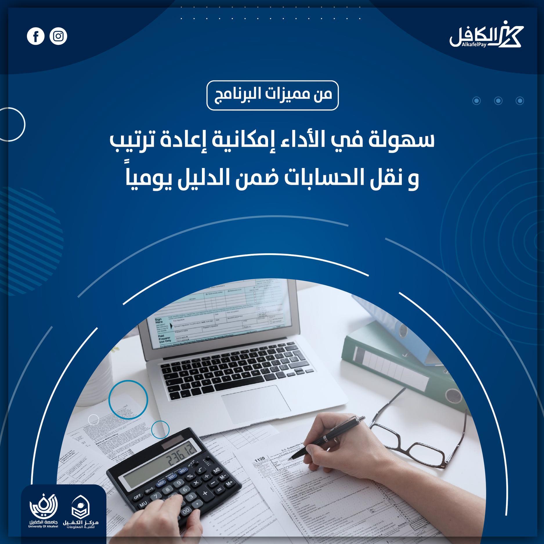 يعتبر برنامج الكافل بيئة عمل متطورة في إدخال وتنظيم الحسابات لمختلف انواع المؤسسات والنشاطات التجارية وغيرها من الأنشطة ، حيث يوفر سيطرة تامة على العمليات المحاسبية و إدارة المخازن وتنظيم الرواتب والأجور بسهولة وسرعة كبيرة وذلك بالإعتماد على النظام المحاسبي العراقي الموحد ، ويمتاز البرنامج بالمرونه وإعدادات وصلاحيات متنوعة في جميع مفاصله ، بالإضافة الى تقارير وجرودات مختلفة كـ ( ميزان المراجعة، دفتر الأستاذ ، ارباح المواد والفواتير).