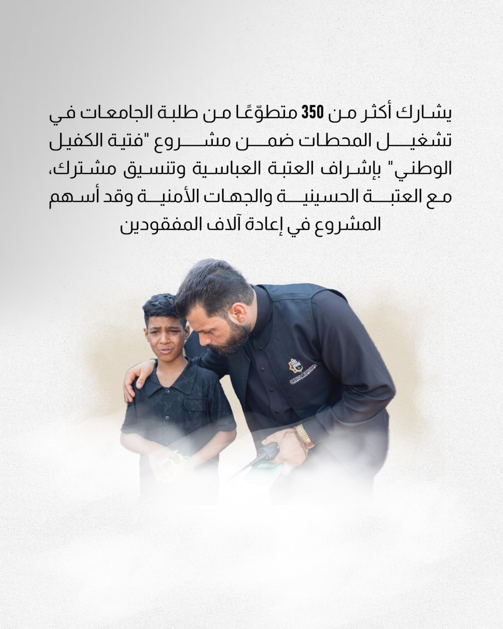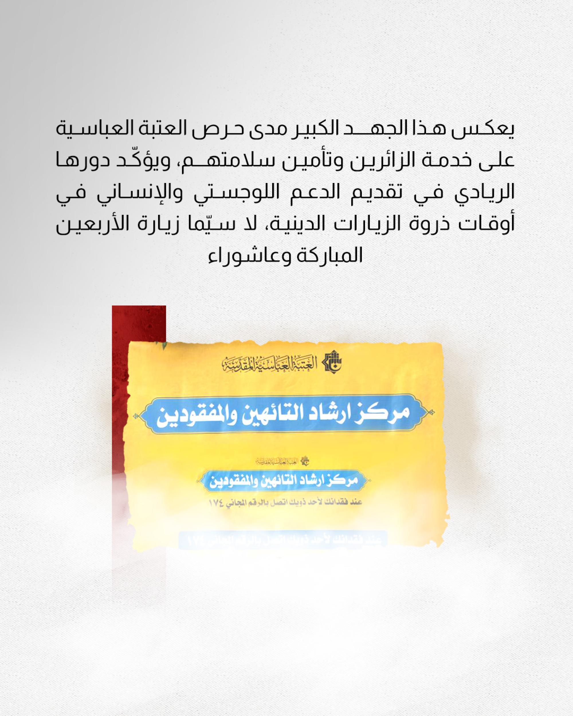 حماية الزائرين والتقليل من حالات الضياع بين الحشود الكبيرة وإعادة التائهين إلى ذويهم بأسرع وقت ممكن من خلال نظام عمل منظم ومحطات موزعة وتقديم خدمات متكاملة تشمل فرق المرشدين، وتقنيات إلكترونية، وتعريفات للزائرين بلغات متعددة؛ لتعزيز الأمان والراحة للزائرين خلال الزيارات المليونية، بما يتماشى مع الأبعاد الإنسانية والخدمية للعتبة المقدسة.