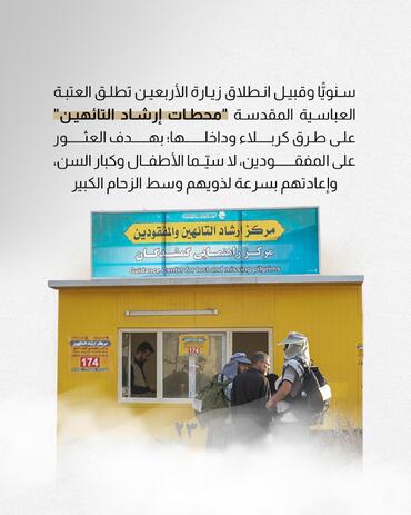 مراكز إرشاد التائهين هي شبكة من المراكز والخدمات الإرشادية التي أنشأتها العتبة العباسية المقدسة وبالتعاون مع جهات عدّة، لتقديم الدعم والمساعدة لزائري أربعين الإمام الحسين (عليه السلام) من خلال إيجاد التائهين لا سيّما الأطفال وكبار السن وإعادتهم إلى ذويهم بسلاسة وأمان، وتشمل الإجراءات تجهيز محطات إرشادية منتشرة على المحاور المؤدية إلى مدينة كربلاء المقدسة، وفرقًا جوالة متخصصة، واستخدام تقنيات حديثة مثل التطبيقات والاتصالات لضمان سرعة الاستجابة.