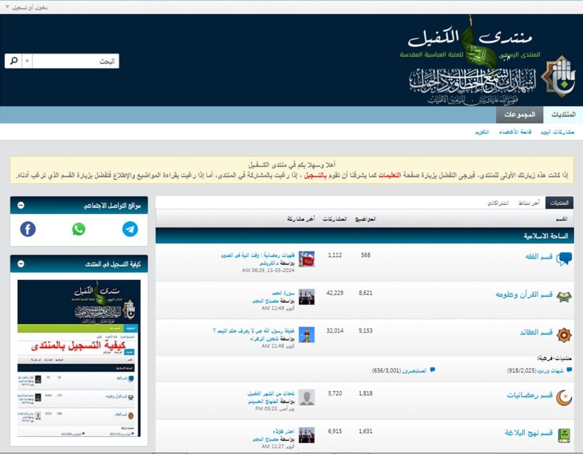 يشرف على المنتدى اساتيذ متخصصين في مجالاتهم، فضاً عن أعضاء ناشطين يبلغ عددهم لغاية كتابة هذه السطور (23,255)، ويبلغ عدد المواضيع والمشاركات فيه أكثر من (621,633). كما تم تطوير منتدى الكفيل من الجيل الثالث إلى الجيل الرابع وهو من أحدث الإصدارات لبرامج المنتديات وهو من إصدارات شركة (vBulletin) أحد الشركات الرائدة في هذا المجال.